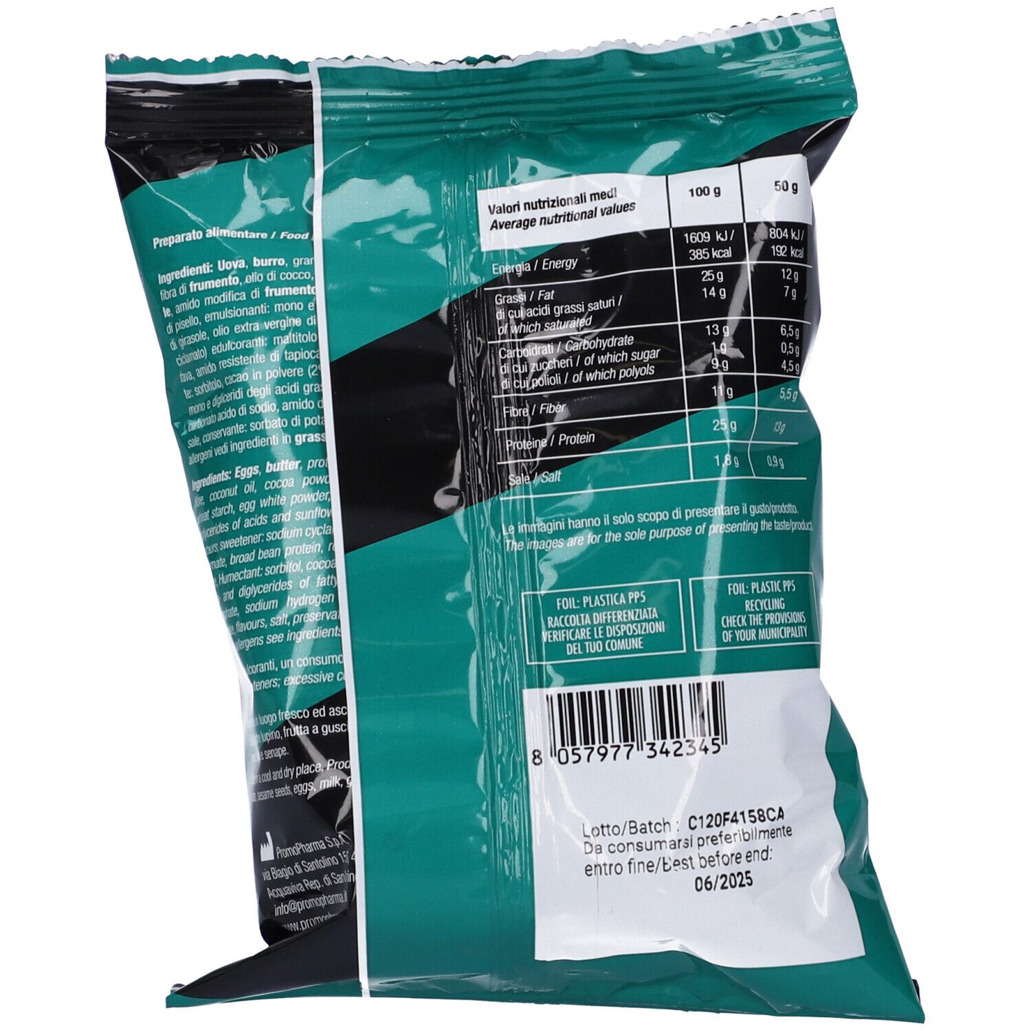 Uova, burro, granulato proteico (proteine di frumento, fibra di frumento, olio di cocco, cacao in polvere, mandorle, nocciole, amido modificato di frumento, albume d’uovo in polvere, proteine di pisello, emulsionanti: mono e digliceridi degli acidi grassi e lecitina di girasole, olio extra vergine di oliva, sale, aromi, edulcorante: sodio ciclamato) edulcoranti: maltitolo e ciclamato di sodio, proteine della fava, amido resistente di tapioca, proteine isolate del latte, umettante: sorbitolo, cacao in polvere (2%), farina di frumento, emulsionante: mono e digliceridi degli acidi grassi, agenti lievitanti: difosfato disodico, carbonato acido di sodio, amido di frumento, carbonati di calcio, aromi, sale, conservante: sorbato di potassio, acidificante: acido lattico. Prodotto in uno stabilimento che utilizza anche lupino, frutta a guscio, semi di sesamo, uova, latte, glutine, avena e soia e senape.