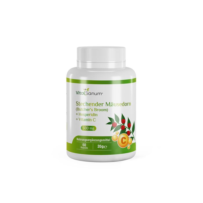 VitaSanum®- Rusco + Esperidina + Vitamina C 500 mg 60 capsule La combinazione di VitaSanum® Rusco (Ruscus aculeatus), esperidina e vitamina C in un integratore alimentare offre una serie di potenziali benefici per la salute in base alle loro proprietà individuali e in base alla sinergia effetti. Ecco alcuni dei principali vantaggi di questa combinazione: Supporta la salute delle vene: il pungitopo pungente è noto per le sue proprietà vasocostrittrici, che possono aiutare a rafforzare le vene e migliorare la circolazione nelle gambe. Ciò lo rende particolarmente utile nel trattamento di problemi come le vene varicose e l’insufficienza venosa cronica. Effetti antiossidanti e antinfiammatori: la vitamina C è un potente antiossidante che aiuta a proteggere le cellule dai danni dei radicali liberi. Può anche ridurre le risposte infiammatorie nel corpo, il che contribuisce alla salute generale. Rafforzamento dell'integrità dei capillari: l'esperidina, un flavonoide presente principalmente negli agrumi, lavora in sinergia con la vitamina C per rafforzare la struttura e la funzione dei capillari sanguigni. Questa combinazione può aiutare a ridurre la permeabilità capillare e ad aumentare la resistenza capillare, il che può essere utile per condizioni come ematoma e gonfiore. Supporto del sistema immunitario: la vitamina C è essenziale per il sano funzionamento del sistema immunitario. Aiuta a stimolare la produzione di globuli bianchi, che svolgono un ruolo importante nella difesa dell'organismo contro le infezioni. Salute della pelle: le proprietà antiossidanti della vitamina C insieme all'esperidina possono anche sostenere la salute della pelle promuovendo la produzione di collagene e proteggendo dai danni legati ai raggi UV. Migliorare la circolazione sanguigna: le proprietà vasocostrittrici del pungitopo possono aiutare a migliorare la circolazione sanguigna, che a sua volta supporta le prestazioni del sistema circolatorio e riduce l'affaticamento delle gambe. Alleviare i sintomi delle emorroidi: attraverso il suo rafforzamento vascolare e le sue proprietà antinfiammatorie, il pungitopo può aiutare ad alleviare i sintomi associati alle emorroidi, come dolore e gonfiore. Controindicazione: questa combinazione può quindi fornire una serie di benefici per la salute, in particolare nei settori della salute circolatoria e antinfiammatoria. Tuttavia, come con tutti gli integratori, è importante consultare un professionista sanitario prima di assumerli per assicurarsi che siano appropriati e sicuri per le proprie specifiche esigenze di salute. INGREDIENTI: Estratto di arancia amara (60% esperidina), estratto di rizoma di pungitopo (5% ruscogenina), rivestimento della capsula (riempitivo: idrossipropilmetilcellulosa), vitamina C (acido ascorbico). CONSERVAZIONE: a temperatura ambiente, fuori dalla portata dei bambini piccoli, al riparo dalla luce e dall'umidità. CONTENUTO: 60 capsule / 60 dosi CONSIGLI D'USO: Una capsula al giorno