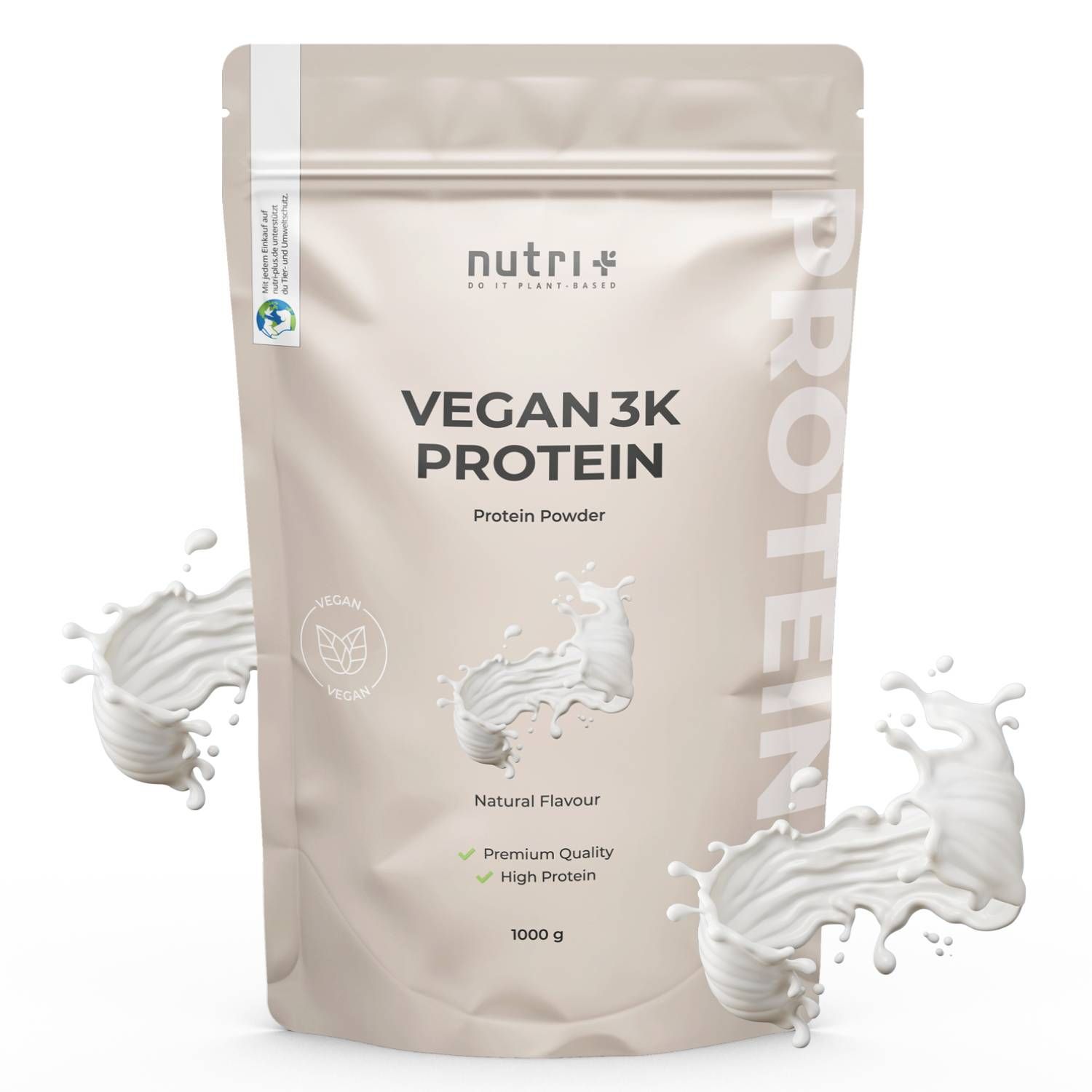 nutri+ Vegan 3K Protein è una proteina multicomponente a base vegetale e consiste in oltre l'80% di proteine (proteine isolate della soia, proteine isolate del pisello e proteine del girasole).