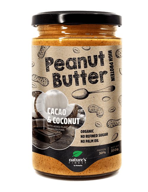 Burro di arachidi naturale arricchito con proteine vegane, cacao fresco e cocco