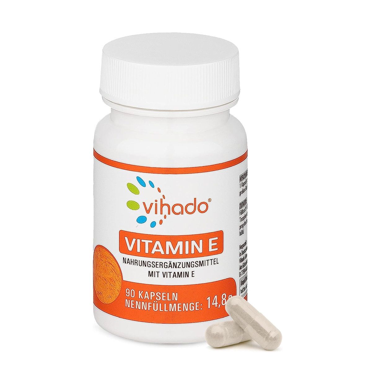 Contenuto della fornitura: 1x capsule di vitamina E Vihado, vitamina E ad alto dosaggio come integratore alimentare, qualità controllata dalla Germania, 1 capsula al giorno, 90 capsule (14,8 g)