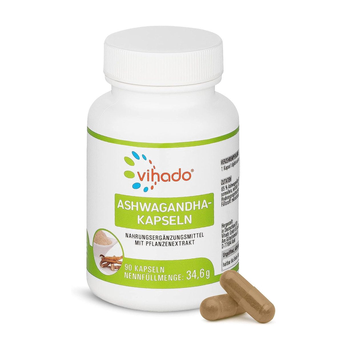 Contenuto della fornitura: 1x capsule Vihado Ashwagandha, integratore alimentare versatile, 250 mg di estratto di radice, di cui 17,5 mg di withanolidi per capsula, 90 capsule (34,6 g)
