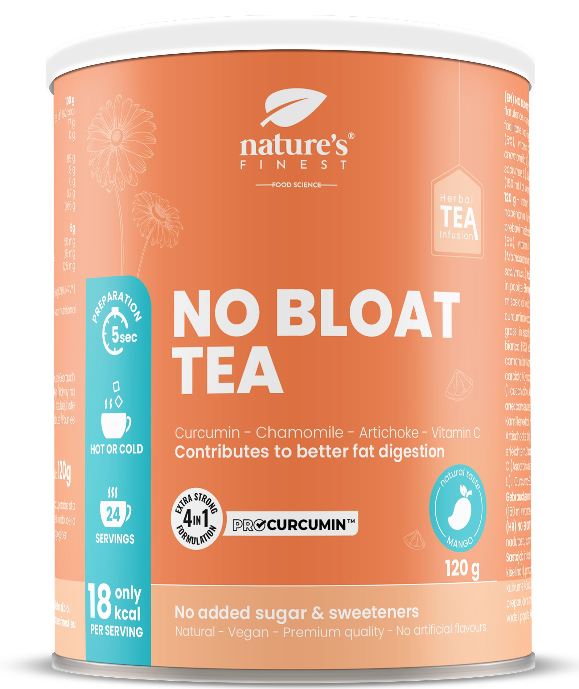 No Bloat Tea non ha zuccheri o dolcificanti aggiunti ed è privo di coloranti artificiali, esaltatori di sapidità e ha un valore calorico estremamente basso, a differenza di altri tè istantanei.