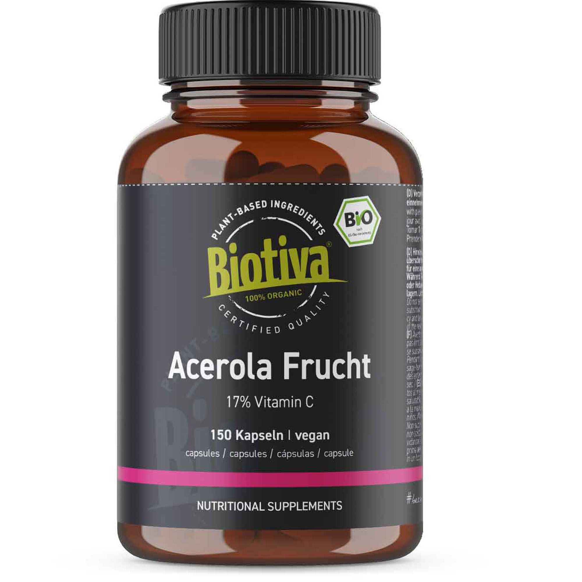 Polvere di frutto di acerola (contenuto di vitamina C del 17%) da coltivazione biologica controllata, involucro della capsula: idrossipropilmetilcellulosa (HPMC)
