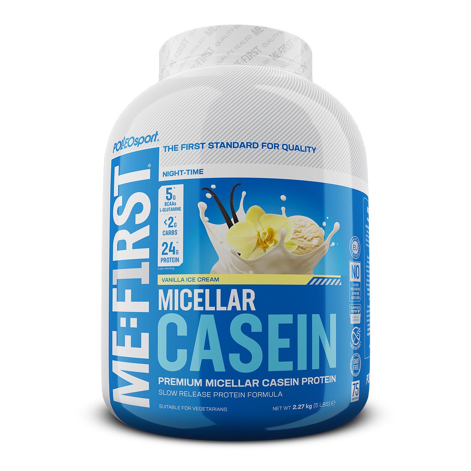 Me: First Micellar Casein è una proteina del latte a digestione lenta, ottenuta dal latte di mucche pascolanti in Irlanda. È ricca di aminoacidi, in particolare di BCAA naturali. Me: First Micellar Casein ha una formula efficace, facilmente digeribile e quindi con un'azione anti-catabolica.