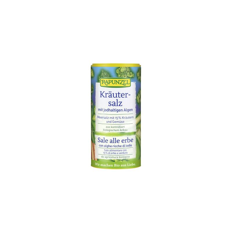 Il sale alle erbe di Rapunzel è il tuttofare per insalate e piatti di verdure, ideale anche per il quark alle erbe. Non deve mancare in nessun uovo a colazione. Durante la produzione, le erbe e le verdure biologiche vengono essiccate delicatamente e poi mescolate con sale marino non raffinato e alghe marine finemente macinate. Si prega di conservare in un luogo asciutto. Contiene sale marino, carote#, SEDANO#, porro#, prezzemolo#, FOGLIE DI SEDANO#, timo#, basilico#, levistico#, aneto#, alghe# (0,40%), santoreggia#. #da coltivazione biologica controllata Valori nutrizionali e risultati delle analisi basati su 100 g Energia: 176 kJ / 42 kcal Grassi: 0,40 g - di cui acidi grassi saturi: 0,10 g Carboidrati: 5,4 g - di cui zuccheri: 3,3 g Fibre: 4,4 g Proteine: 2,0 g Sale: 83,0 g Contiene 2 µg di iodio / 100 g