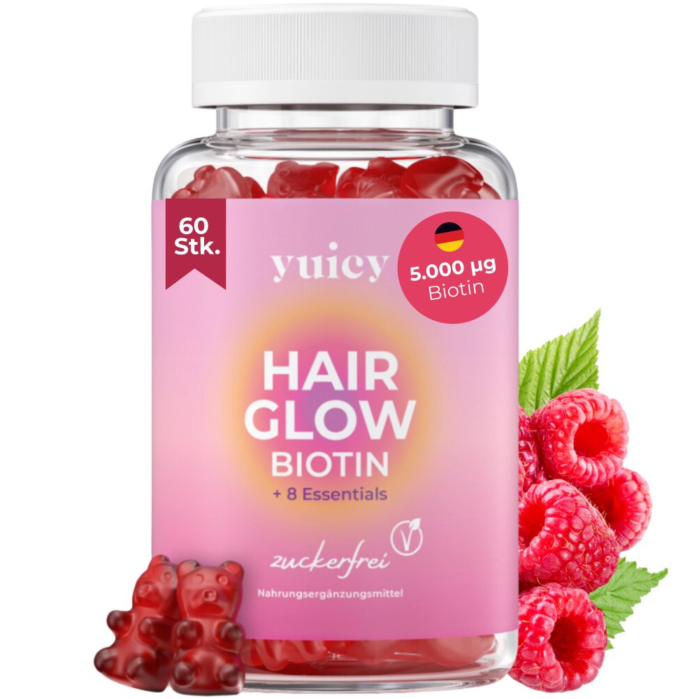 Vitamine per i capelli con biotina contro la caduta dei capelli - yuicy® Hair Glow Gummies al gusto fruttato di arancia. Deliziose gommose alla biotina per pelle, capelli e unghie. Le vitamine per i capelli yuicy sono il mix perfetto di nutrienti per accelerare la crescita dei capelli. Rafforzano i capelli dall'interno con le migliori vitamine e minerali. Sono sviluppate per promuovere una crescita naturale e rapida dei capelli. La formulazione è basata su sostanze nutritive con effetti scientificamente provati.