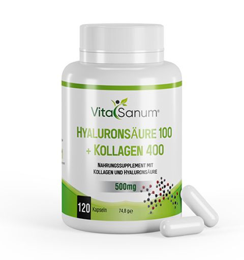 L'acido ialuronico, noto anche come ialuronato, è una sostanza la cui importante funzione è quella di immagazzinare acqua nei tessuti, in particolare nella pelle, nel tessuto connettivo e negli occhi. L'acido ialuronico ha molti usi, è molto popolare come integratore alimentare in capsule. L'utilizzo dell'acido ialuronico provoca una migliore idratazione della pelle, migliorandone l'aspetto e l'elasticità. È stato scientificamente dimostrato che dosaggi di 120-240 mg al giorno per almeno un mese aumentano significativamente l'umidità della pelle e riducono la secchezza della pelle negli adulti. La pelle idratata appare più liscia, riducendo la visibilità delle rughe. Inoltre, l'acido ialuronico provoca una migliore idratazione e secrezione del liquido sinoviale (allevia i sintomi del dolore articolare e nutre la cartilagine) e accelera anche la guarigione delle ferite. Il collagene è presente in circa il 25% delle nostre strutture corporee. I benefici derivanti dall'assunzione di collagene includono la rigenerazione del sistema muscolo-scheletrico (articolazioni, muscoli, ossa). Rigenerazione della pelle (riduzione delle rughe e inibizione dei processi di invecchiamento cutaneo), dei capelli e delle unghie. Adeguata idratazione del corpo e controllo del peso.