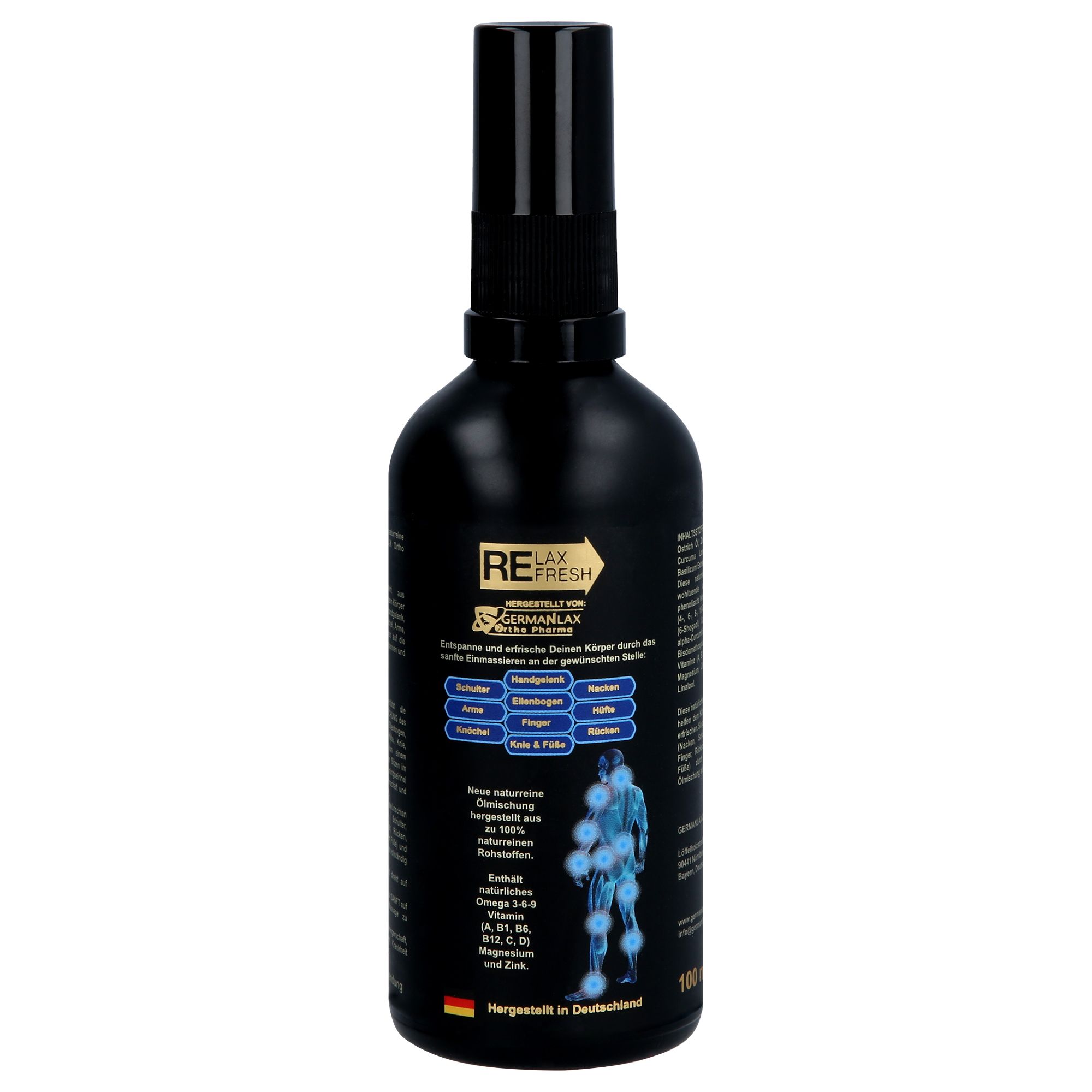 Relax & Refresh è una nuova miscela gel/olio completamente naturale, prodotta da GERMANLAX Ortho Pharma. Relax & Refresh è composto da ingredienti naturali che, massaggiati delicatamente sulla zona desiderata del corpo (nuca, spalle, gomiti, polso, dita, schiena, fianchi, ginocchia, caviglie, braccia, piedi), aiutano a rilassare e rinfrescare. |