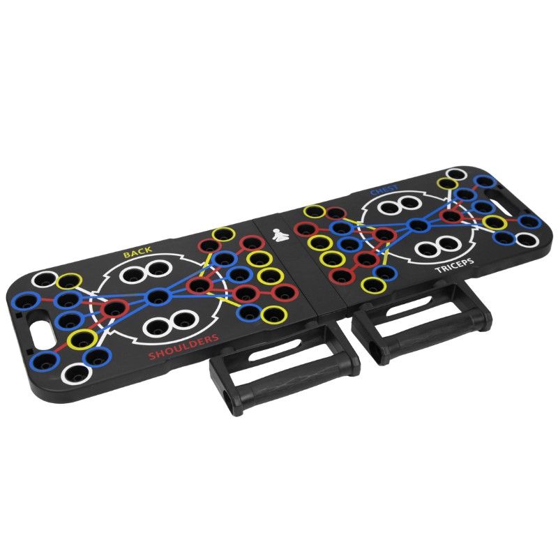 Tavola per piegamenti richiudibile con coppia di push-up bar in dotazione. Colorazione differenziata per i diversi gruppi muscolari: petto, spalle, tricipiti e schiena. Grazie alle diverse posizioni e configurazioni delle maniglie, la push-up board è adatta per una moltitudine di esercizi e si adatta a fisici di altezza, struttura e peso diversi, utilizzabile in piena sicurezza grazie ai gommini antiscivolo e ai solidi bloccaggi delle maniglie. Ingombro ridotto e facilmente trasportabile.