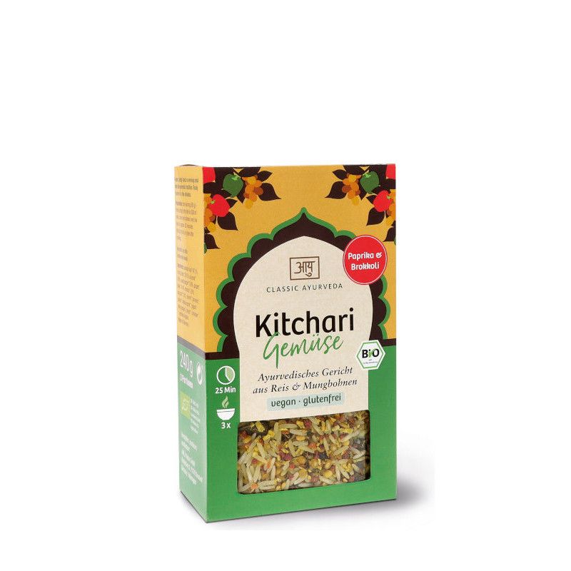 Ayurveda Organic Kitchari con verdure è uno stufato con riso basmati, fagioli mung, cocco, datteri, broccoli e spezie.