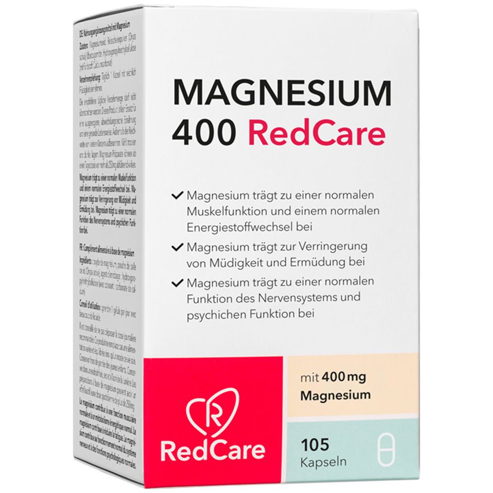 Una capsula di Magnesium 400 RedCare è sufficiente a coprire il fabbisogno giornaliero di magnesio. La capsula deve essere presa con molto liquido. Ci sono 105 capsule in una confezione. Questi durano tre mesi. Poiché il magnesio in quantità elevate può avere un effetto lassativo, la quantità massima di una capsula al giorno non dovrebbe essere superata.