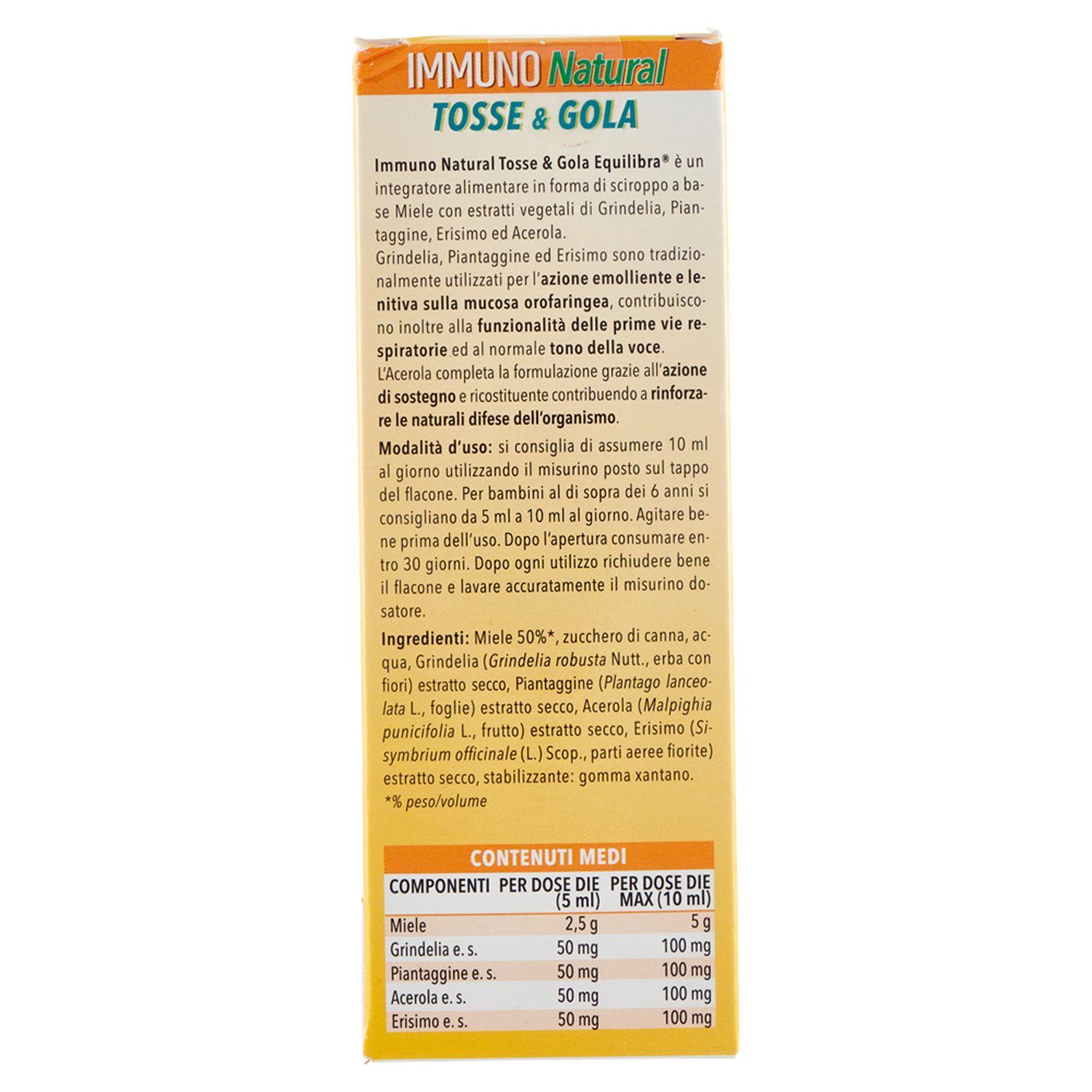 Immuno Natural Tosse & Gola Equilibra® è un integratore alimentare in forma di sciroppo a base Miele con estratti vegetali di Grindelia, Piantaggine, Erisimo ed Acerola. Grindelia, Piantaggine ed Erisimo sono tradizionalmente utilizzati per l’azione emolliente e lenitiva sulla mucosa orofaringea, contribuiscono inoltre alla funzionalità delle prime vie respiratorie ed al normale tono della voce. L’Acerola completa la formulazione grazie all’azione di sostegno e ricostituente contribuendo a rinforzare le naturali difese dell’organismo.