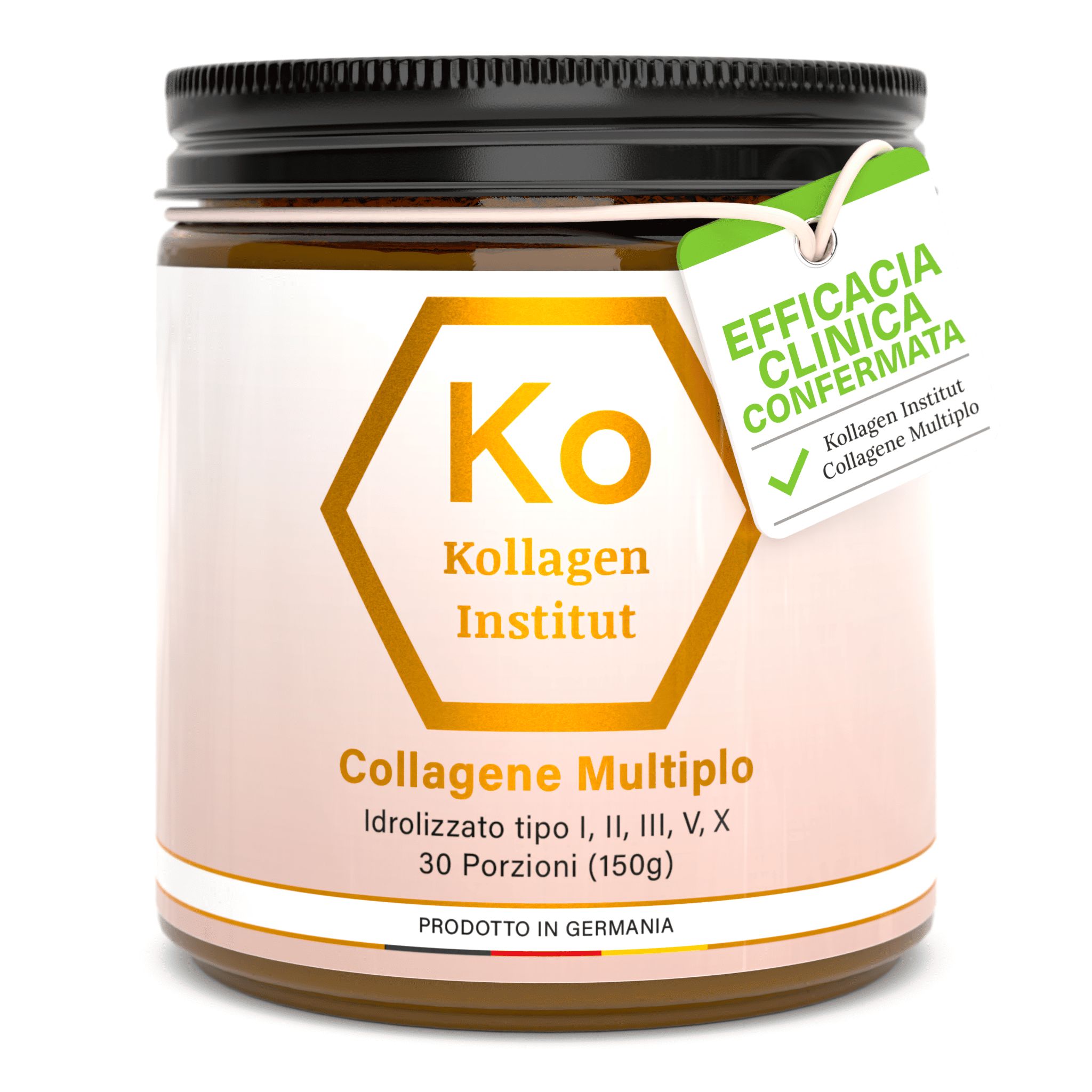 Collagene puro al 100% da peptidi brevettati dei tipi di collagene essenziali I, II, V, X. Ogni tipo di collagene ha compiti specifici per i diversi tessuti (ad es. pelle, ossa, tendini, cartilagine, muscoli).