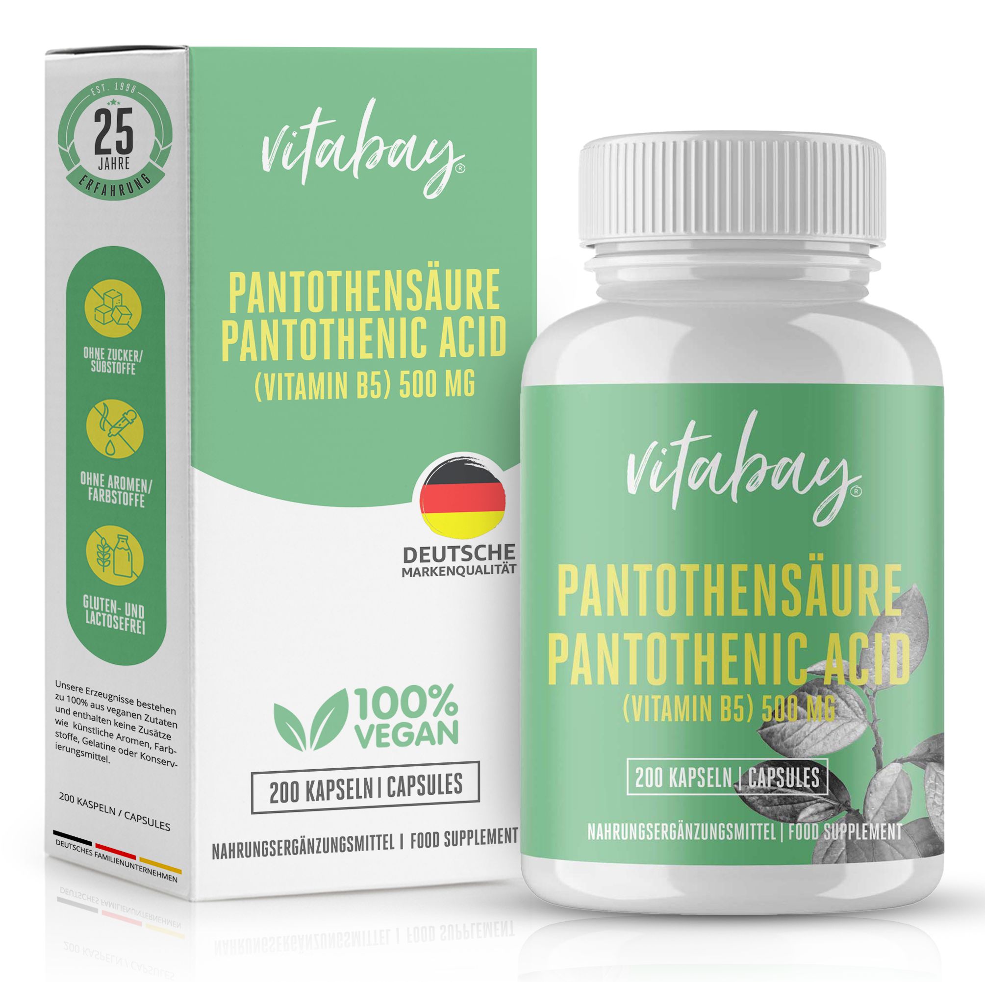L'acido pantotenico, o vitamina B5, è una vitamina B idrosolubile e un derivato della β-alanina. L'elevato dosaggio di Vitabay ha un'ampia gamma di applicazioni nutrizionali e fisiologiche. Rispetto ad altri produttori, utilizziamo la vitamina B5 con rivestimento enterico. Il vantaggio è che la vitamina B5 (acido pantotenico) è ben assorbita dall'organismo. La vitamina B5 non rivestita entericamente viene assorbita dall'organismo solo in misura limitata!