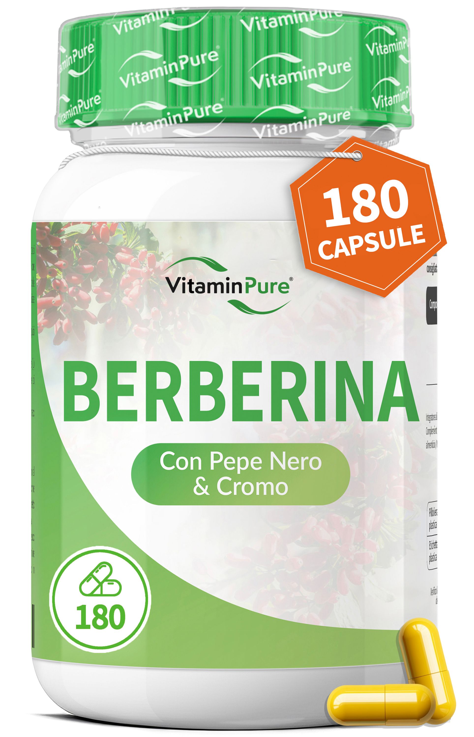180 CAPSULE : Il nostro integratore Berbernina è disponibile in un pratico barattolo da 180 capsule vegane, con rivestimento vegetale e assolutamente privo di OGM, lattosio, glutine, magnesio stearato e biossido di silicio, garantendo un prodotto puro e adatto a diverse esigenze alimentari. Grazie al contenuto di 180 capsule, il barattolo può coprire un fabbisogno che varia da 3 a 6 mesi, a seconda della dose giornaliera. Se ti basta assumere 500mg di berberina, una capsula al giorno sarà sufficiente per un trattamento di 6 mesi. Se invece necessiti di una dose più forte di berberina 1000mg pura, assumendo 2 capsule al giorno avrai una copertura di 3 mesi.