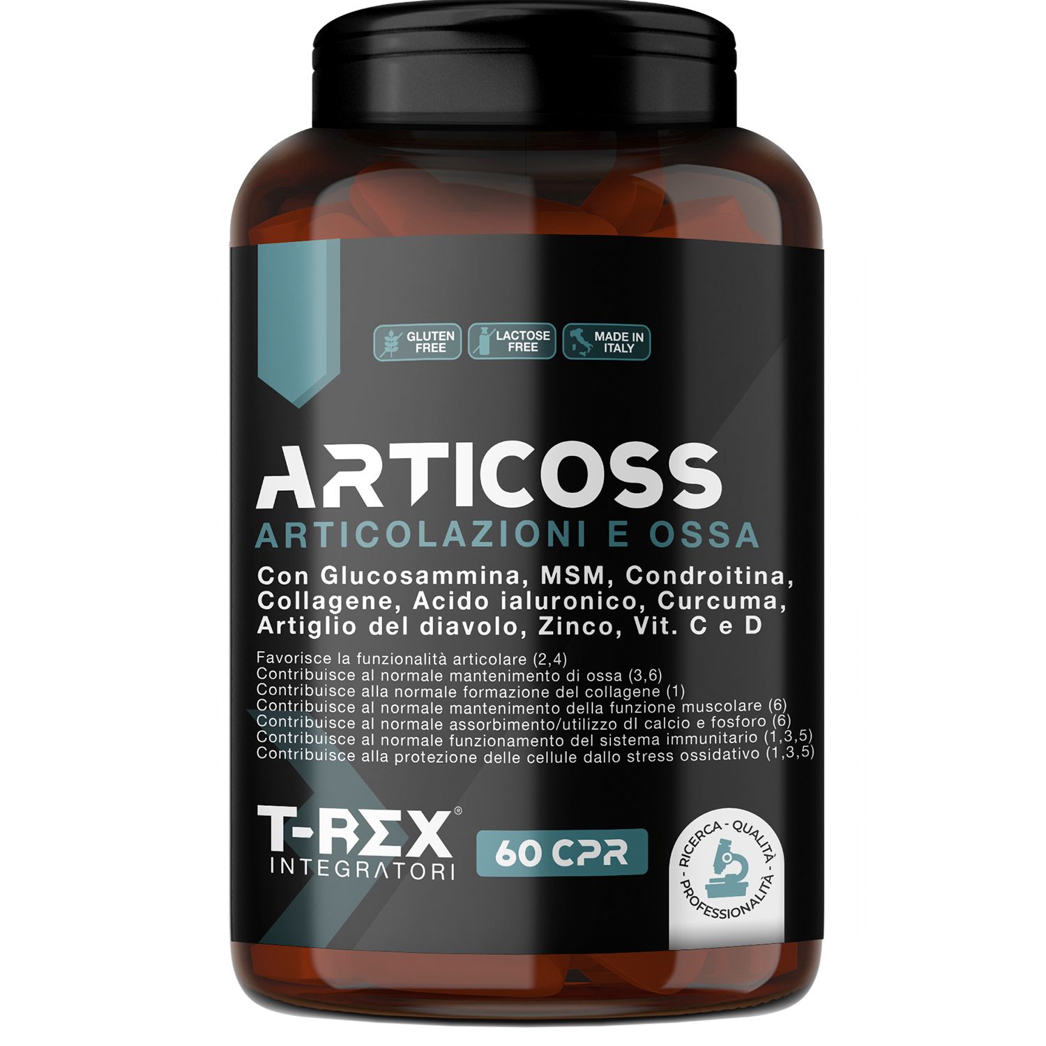 Articoss Articolazioni ed Ossa di T-Rex Integratori è un integratore alimentare a base di Glucosammina, Collagene, Condroitina, MSM, Acido Ialuronico ed Artiglio del Diavolo, Selenio, Zinco, Prolina, Manganese e con l’aggiunta di Vitamina C e Vitamina D.
