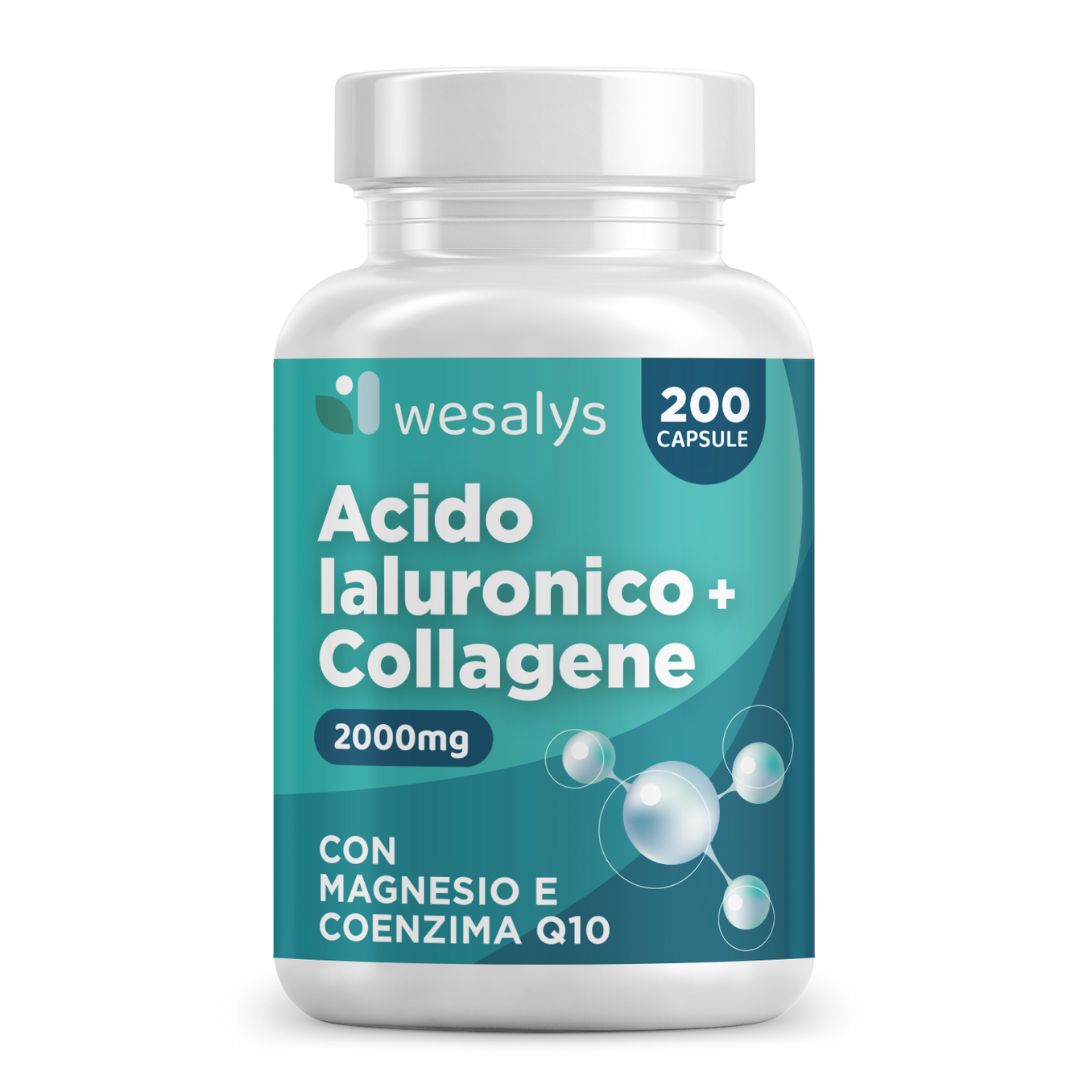 Riscopri la bellezza della tua pelle e il benessere delle tue articolazioni. Un integratore alimentare ideato per rivitalizzare la tua bellezza naturale e a mantenere la flessibilità delle tue articolazioni agendo dall’interno del tuo corpo. Formulato con un’innovativa miscela di peptidi di Collagene idrolizzato denominata PEPTIPLUS XB®, con una qualità Premium ed un elevatissimo assorbimento, in grado di rinnovare le cellule e di favorire l’elasticità della cute per una pelle più sana e giovane. PEPTIPLUS XB® nella sua forma idrolizzata, viene assorbito rapidamente, accumulandosi a livello cutaneo ringiovanendo i tessuti. La combinazione ad Alto Dosaggio di 2000mg di Collagene Idrolizzato, 500mg di Acido Ialuronico, Coenzima Q10, Zinco e Vitamina E, migliora l’idratazione della pelle, rendendola più elastica, liscia e compatta, attenuando la comparsa delle rughe. La Vitamina C naturale estratta da Rosa Canina favorisce la produzione di Collagene. Grazie al potere lubrificante di ben 500mg di Acido Ialuronico le tue ossa saranno più robuste e le tue articolazioni maggiormente flessibili, migliorandone la mobilità; Il Coenzima Q10, in associazione alla Vitamina C naturale e allo Zinco, determinano un’azione antiossidante sulla pelle ed antinfiammatoria, contrastando la formazione di radicali liberi che determinerebbero l’invecchiamento cutaneo e riducendo l’infiammazione articolare. ACIDO IALURONICO + COLLAGENE WESALYS è prodotto in Italia con i migliori principi attivi Naturali e Sicuri, garantendo il massimo beneficio senza effetti collaterali indesiderati.
