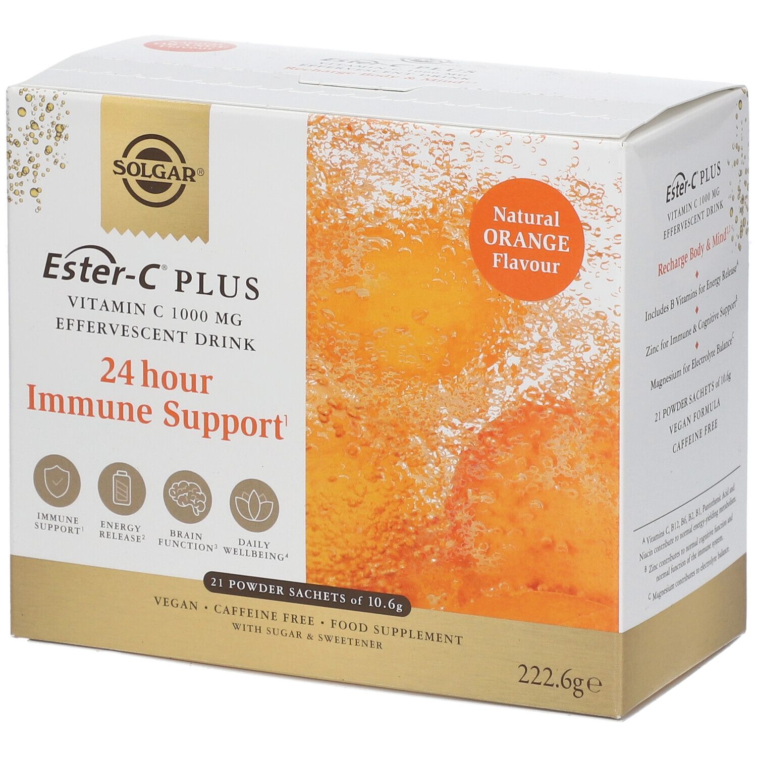 Solgar presenta una formulazione in monodose al gusto arancia, studiata come integratore alimentare contenente vitamine (tra cui vitamina C, vitamine del gruppo B, folati e vitamina B12) e minerali come zinco, magnesio e calcio. Contiene Ester-C®, marchio registrato di The Ester-C Company. Ingredienti includono fruttosio, regolatori di acidità (acido malico, acido citrico), maltodestrina, aromi naturali (aroma naturale d'arancia), agente antiagglomerante (biossido di silicio), edulcorante (glicosidi steviolici) e colorante (beta-carotene). Adatto a vegetariani e vegani; formulato senza glutine, senza grano, derivati del latte, soia e lievito e senza aromi artificiali. Conservare in luogo fresco e asciutto e seguire le istruzioni per l'uso.