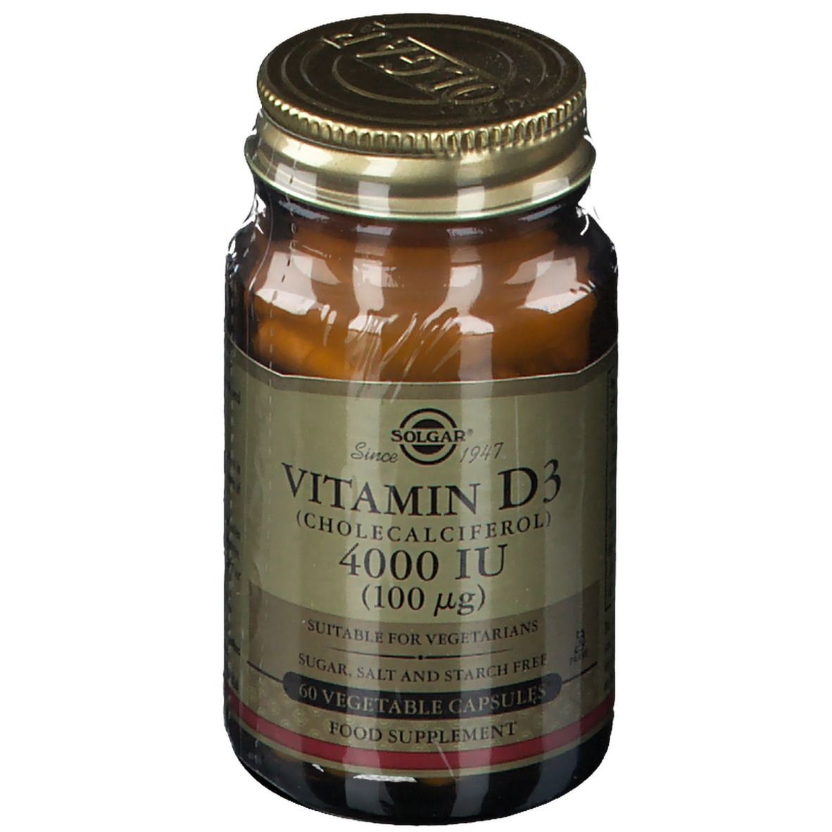 Solgar Vitamina D3 (colecalciferolo) 4000 UI (100 µg) in confezione da 60 capsule vegetali. Formula ad alta concentrazione di vitamina D3, la forma che l’organismo utilizza più facilmente. Ideale per integrare l’esposizione solare e la dieta quando necessario. Ingredienti: agenti di carica (cellulosa microcristallina, maltodestrina, etilcellulosa), capsula vegetale (idrossipropilmetilcellulosa), antiagglomerante (stearato di magnesio vegetale), vitamina D3 (4000 UI, colecalciferolo, 100 µg, 2000% VRN). Modalità d’uso: per gli adulti, assumere una (1) capsula vegetale al giorno preferibilmente durante i pasti. Non superare la dose giornaliera raccomandata. Avvertenze: i complementi alimentari non sostituiscono una dieta equilibrata e uno stile di vita sano. Conservare fuori dalla portata dei bambini. In caso di gravidanza, allattamento, terapie in corso o patologie consultare il medico prima dell’uso.