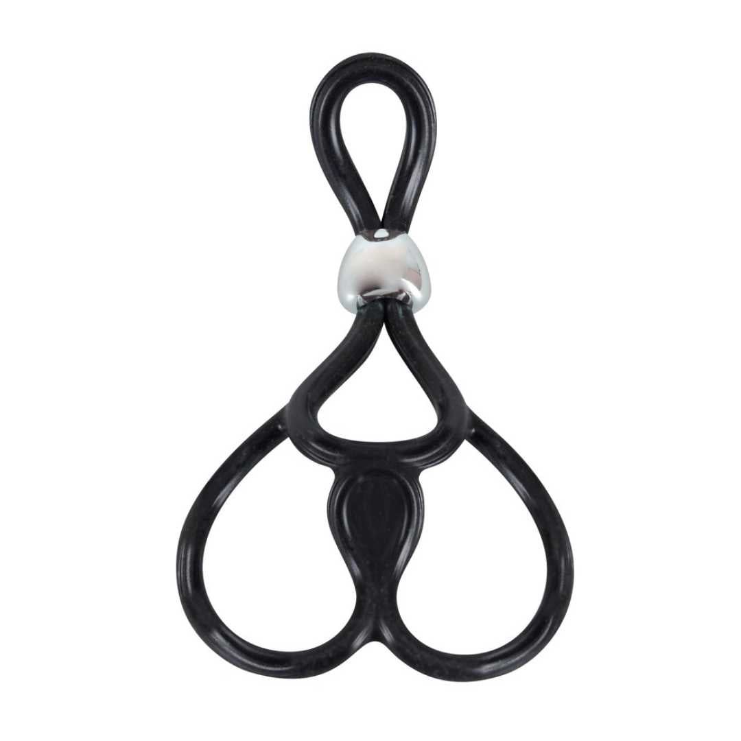 Anello per pene uomo-oh-man con due anelli per testicoli (Ø circa 3 cm ciascuno, estensibile). Anello per il pene regolabile individualmente con perline scorrevoli. Lunghezza totale circa 13 cm. Nero. Silicone, ABS.
