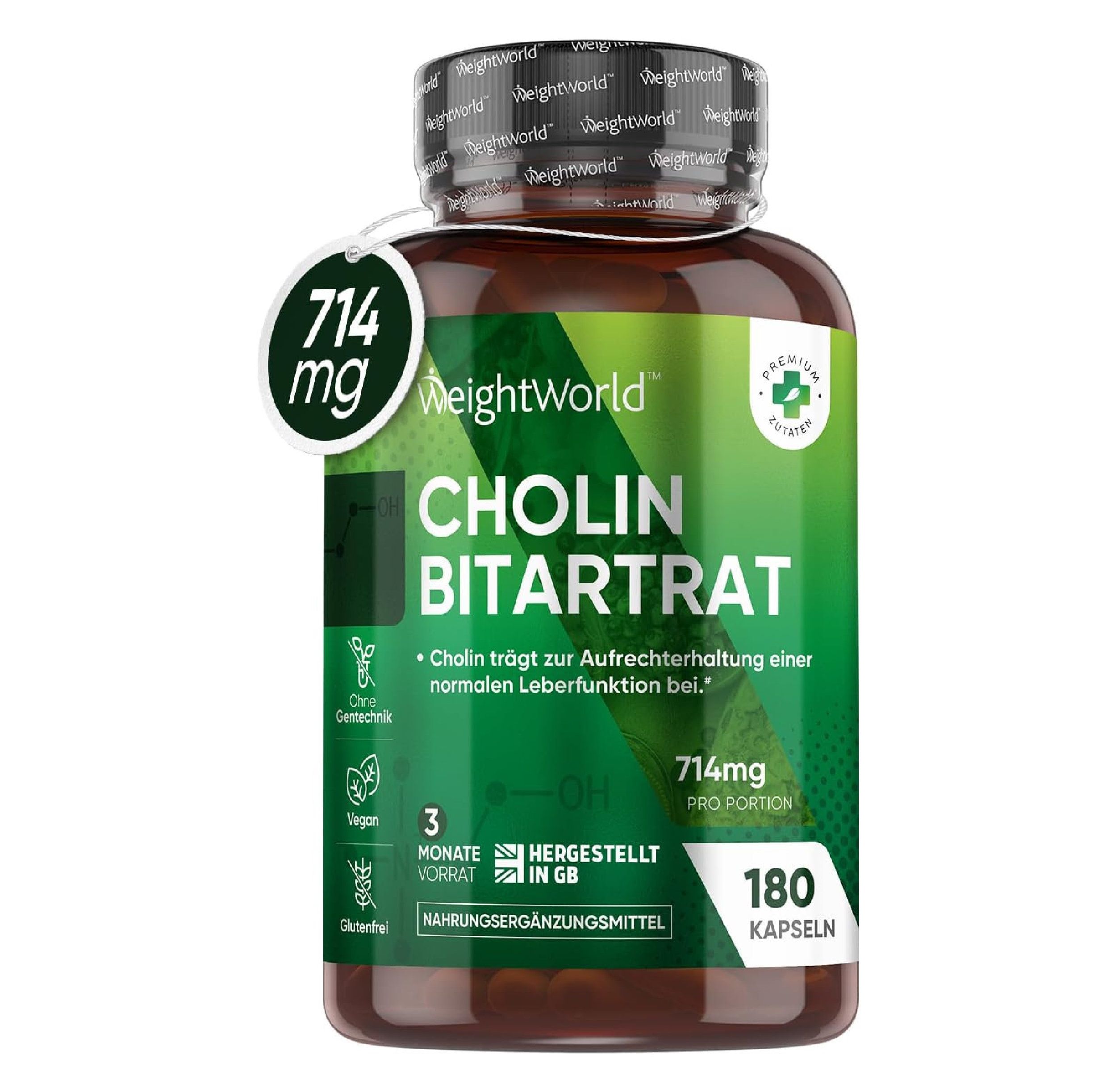 Apporto giornaliero pratico – ogni flacone di colina bitartrato WeightWorld contiene 180 capsule, pari a una scorta di circa 3 mesi. Assumere 2 capsule al giorno con un bicchiere d’acqua, preferibilmente durante un pasto. Ogni porzione apporta 714 mg di colina bitartrato