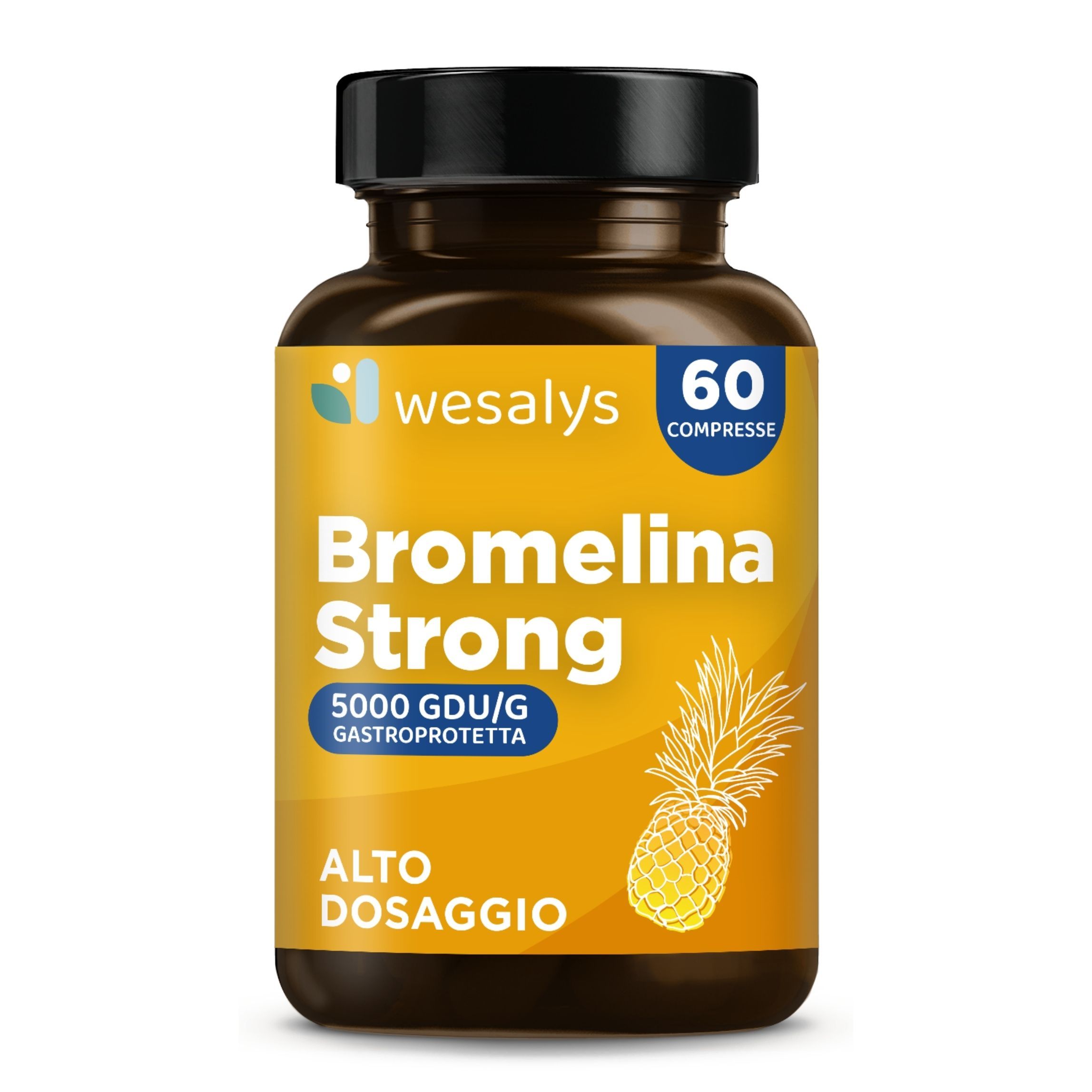 Dai laboratori di ricerca e sviluppo WESALYS nasce Bromelina Strong a base di 1600 mg di Bromelina per dose massima giornaliera. Con Bromelina 5000 GDU/g Gastroprotetta. Bromelina Strong rappresenta il tuo alleato naturale per drenare il tuo organismo, agevolare la digestione, contrastare gli inestetismi della cellulite e il gonfiore alle gambe, inoltre svolge un’azione antinfiammatoria ed antiedema. Bromelina Strong contiene al suo interno Bromelina 5000 GDU/g Gastroprotetta. Assumendo 2 compresse al giorno, otterrai ben 1600 mg di Bromelina, il dosaggio più alto presente sul mercato, assicurando un apporto elevato di questo fenomenale principio attivo dalle importanti proprietà. Riscopri la gioia del tuo benessere con Bromelina Strong di WESALYS, il tuo alleato quotidiano per il benessere che parte dall'interno. Bromelina Strong di WESALYS è prodotto in Italia con i migliori Estratti Vegetali, Certificati e Sicuri, garantendo il massimo beneficio senza effetti collaterali indesiderati. Privo di Glutine, Lattosio, OGM, Coloranti ed Additivi Artificiali. Inoltre è anche Adatto ai Vegani. Prodotto notificato presso il Ministero della Salute italiano con numero di registrazione: 172466