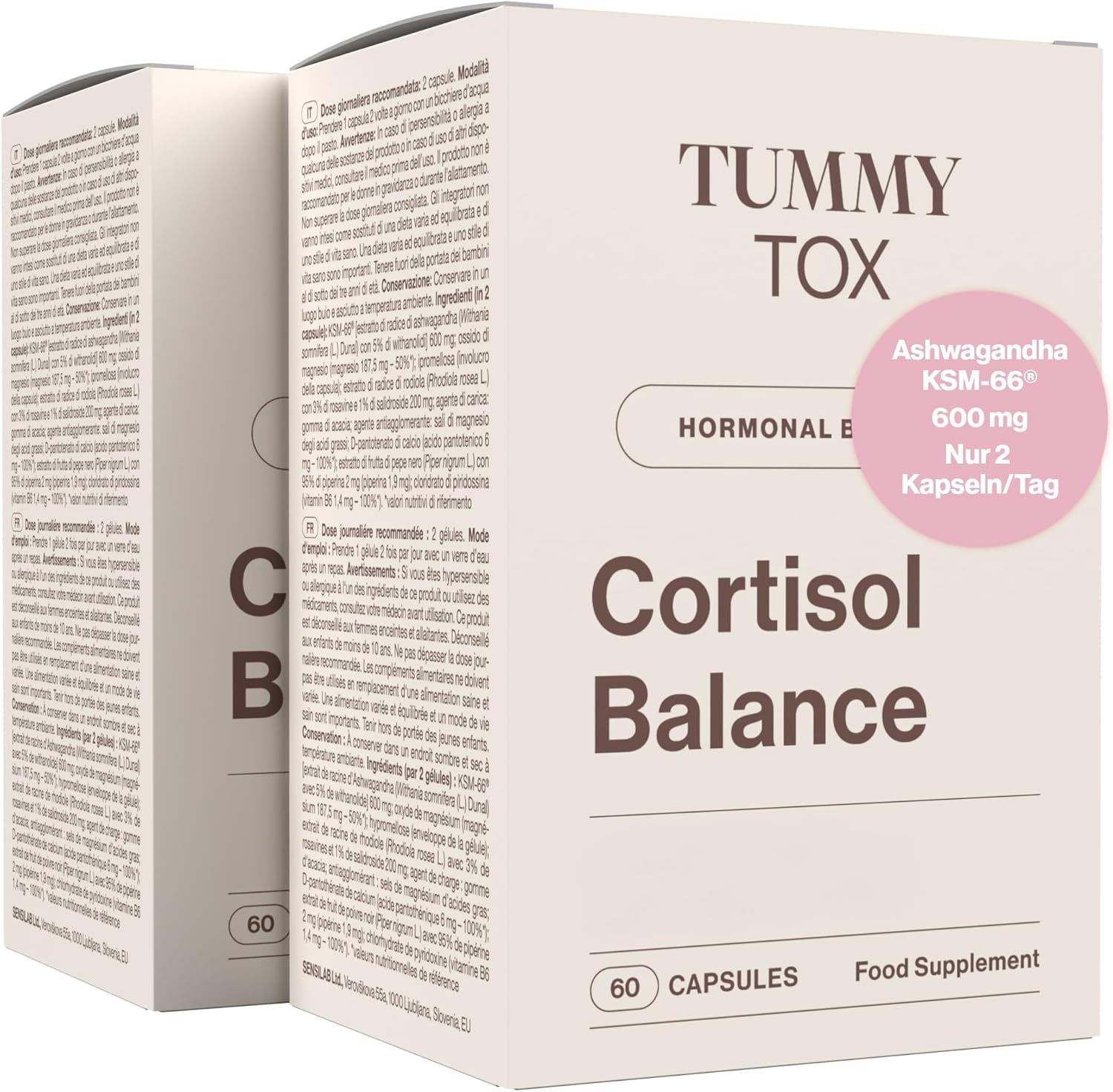 Estratto di radice di ashwagandha KSM-66® (Withania somnifera (L.) Dunal) con 5% di withanolidi: 600 mg; ossido di magnesio: 187,5 mg (50% VNR); estratto di radice di rodiola (Rhodiola rosea L.) con 3% di rosavine e 1% di salidroside: 200 mg; D-pantotenato di calcio (acido pantotenico): 6 mg (100% VNR); estratto di frutto di pepe nero (Piper nigrum L.) con 95% di piperina: 2 mg (piperina 1,9 mg); cloridrato di piridossina (vitamina B6): 1,4 mg (100% VNR).