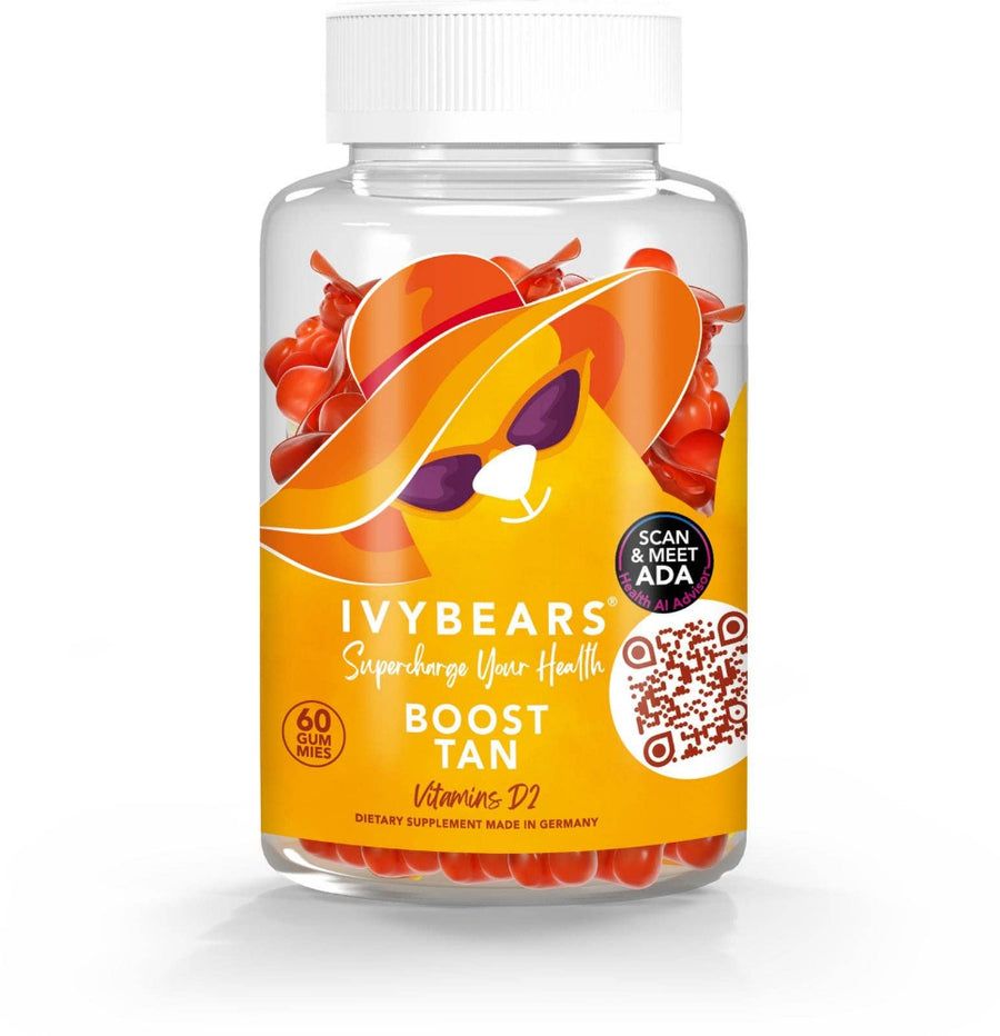IvyBears Boost Tan sono gommose multivitaminiche vegane con beta-carotene, vitamine e minerali selezionati. Contengono vitamina A, C, D, E, riboflavina e zinco che contribuiscono a funzioni corporee normali e al mantenimento di pelle, ossa e sistema immunitario. Con un gusto fruttato piacevole, sono facili da integrare nella routine quotidiana, sempre come parte di una dieta varia ed equilibrata.
