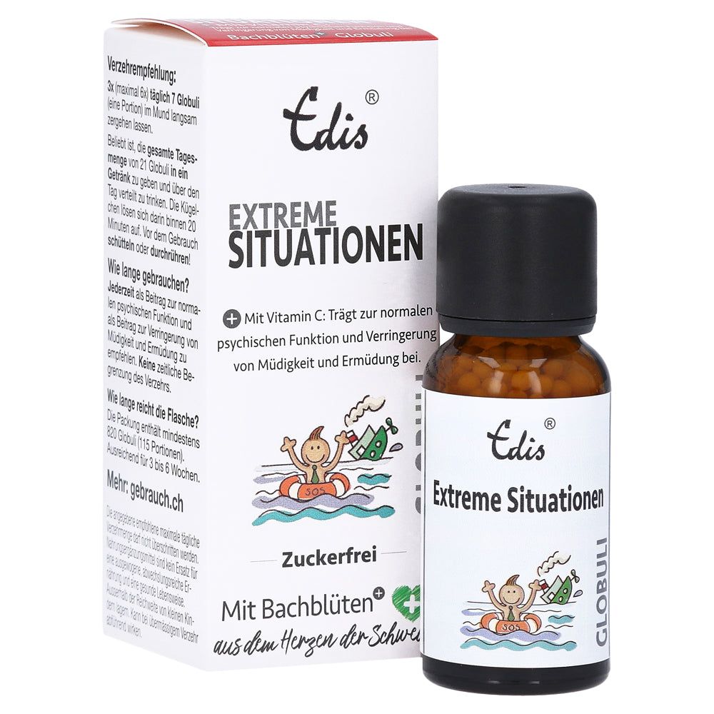 Globuli Bach per Situazioni Estreme (Miscela di Emergenza) Edis® Globuli senza zucchero, dolcificati con xilitolo che protegge i denti. Questo è un integratore registrato (Numero di registrazione DE 101.11101.0.04286) con una miscela di fiori di Bach selezionata da terapeuti e vitamina C, che contribuisce alla normale funzione psicologica e alla riduzione di stanchezza e affaticamento.