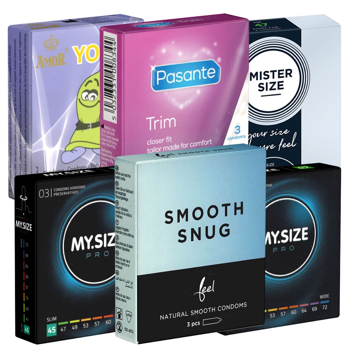 Questa confezione di prova di preservativi è stata sviluppata appositamente per gli utenti che preferiscono una vestibilità più stretta. Composto da sei marchi rinomati, ciascuno in una comoda confezione da 3, il set offre una selezione di larghezze nominali tra 45 mm e 49 mm.