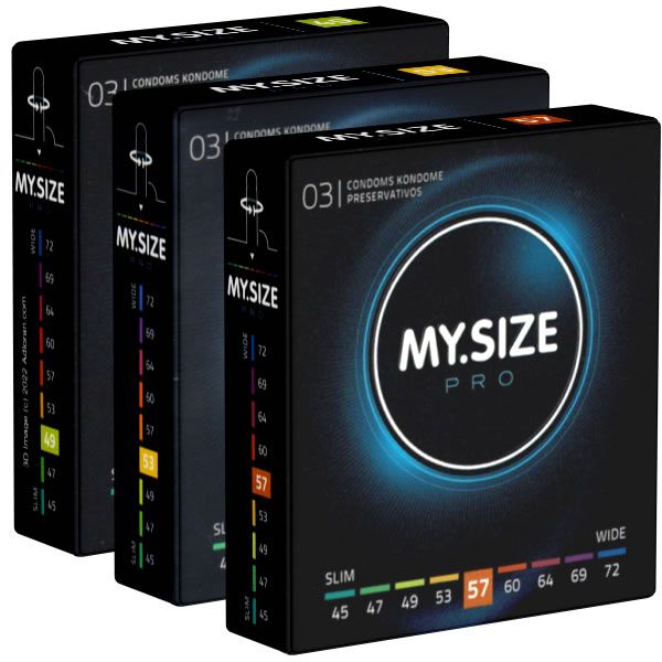Il pacchetto di prova per tutti gli uomini che non vogliono misurare o calcolare. 3 tipi di preservativi MY.SIZE PRO in diverse dimensioni. Da provare e testare.