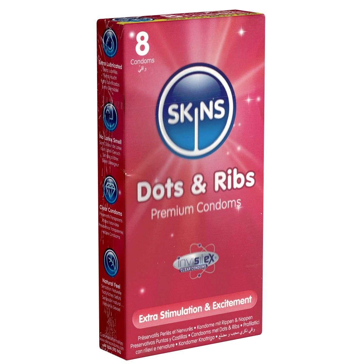 Skins «Dots & Ribs» contiene otto preservativi testurizzati in lattice di gomma naturale che, grazie alla loro texture a puntini e nervature, offrono una stimolazione mirata durante il rapporto. La combinazione di queste due caratteristiche superficiali offre una maggiore stimolazione per entrambi i partner.