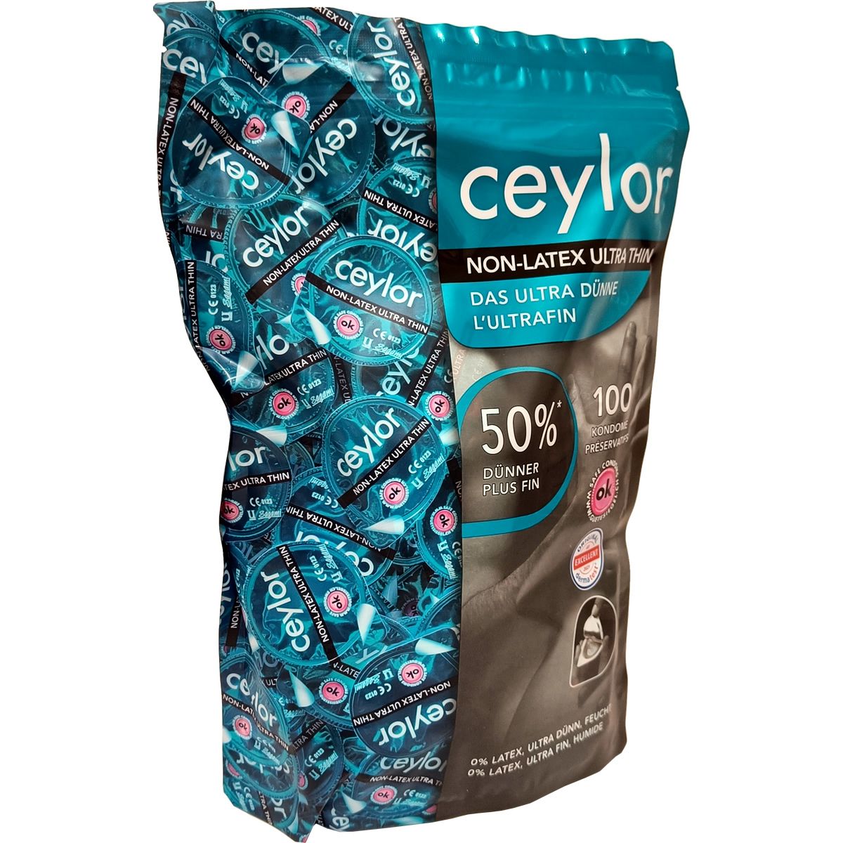Preservativi in poliuretano con serbatoio, altamente trasparenti, inodori, con gel lubrificante a base di olio siliconico. 50% più sottili che preservativi ceylor standard.