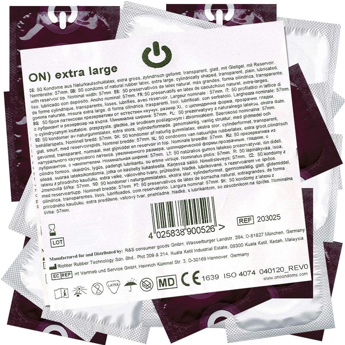 I preservativi On) «Extra Large» in confezione da 50 sono ideali per gli uomini che preferiscono una vestibilità più ampia. Con una larghezza nominale di 57 mm e una lunghezza di 185 mm, questi preservativi offrono comfort e sicurezza ottimali. Sono realizzati in lattice di gomma naturale di alta qualità, che garantisce elevata elasticità e resistenza allo strappo. L'idratazione con olio di silicone crea una piacevole sensazione di morbidezza.