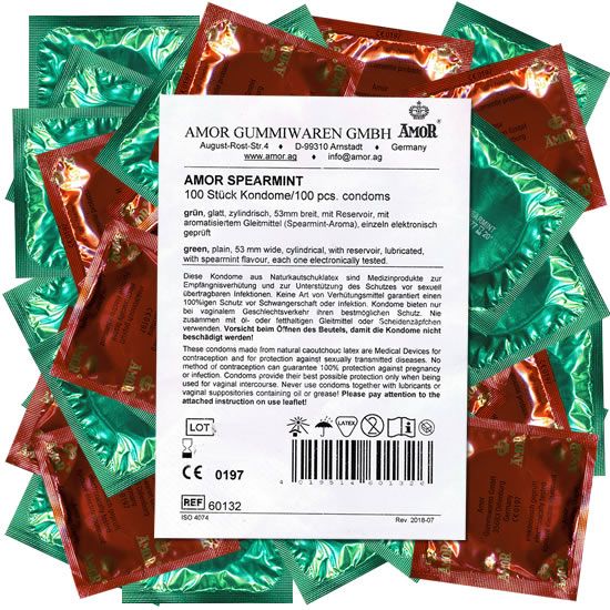 100 preservativi in lattice, aromatizzati - con gusto di menta, lubrificanti, colorati verdi, forma cilindrica, con serbatoio, larghezza nominale: 53mm.