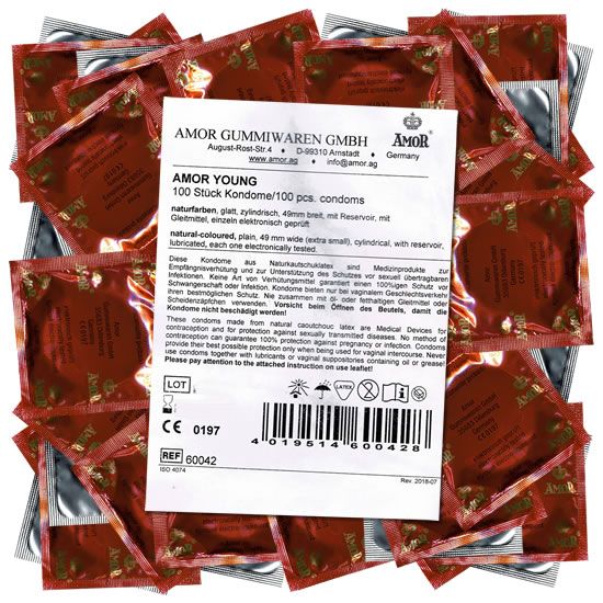 Il preservativo Amor Young in confezione maxi da 100 pezzi è stato sviluppato appositamente per uomini giovani e persone con un pene stretto e offre una tenuta ottimale con una larghezza di 49 mm e una lunghezza di 175 mm. Realizzato in lattice di gomma naturale di alta qualità e inumidito con olio di silicone, il preservativo assicura uno scorrimento fluido e una vestibilità confortevole. La forma cilindrica con serbatoio favorisce una manipolazione sicura e offre una protezione aggiuntiva.