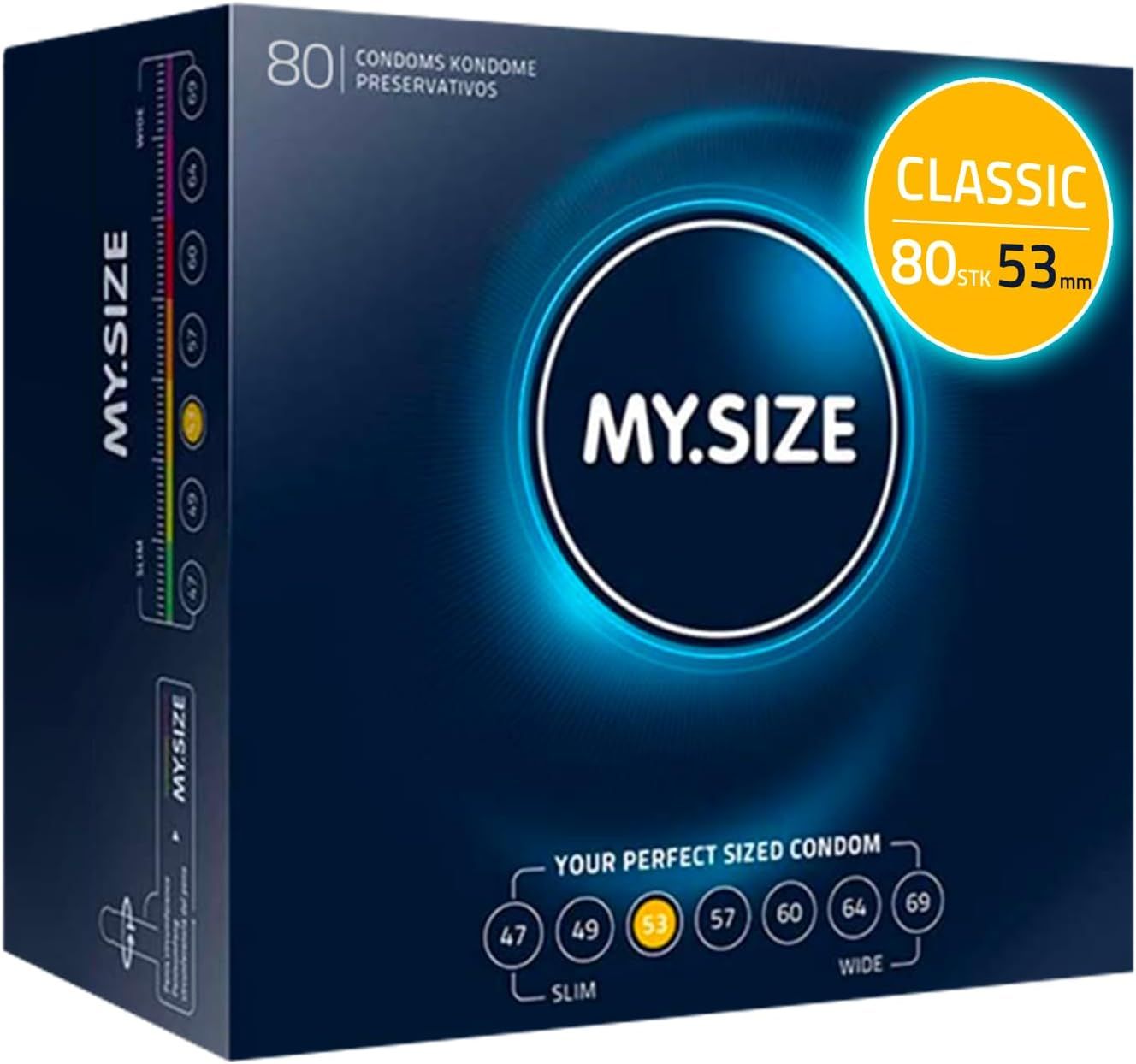 IL MEGA AFFARE: preservativo MY.SIZE, larghezza 53 mm, 80 pezzi. Disponibile in altre larghezze nominali. Etichettato CE. Conforme alla direttiva UE sui dispositivi medici 93/42 CEE. Con applicazione di misurazione online gratuita.