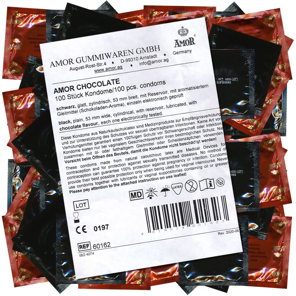 I preservativi Amor «Chocolate» in confezione maxi da 100 sono la combinazione perfetta tra protezione e seduzione. Questi preservativi al gusto di cioccolato fondente aggiungono un tocco speciale all'intimità, mascherando il tipico odore del lattice. La superficie liscia e umida, inumidita con olio di silicone, garantisce una sensazione piacevole e morbida e un'elevata capacità di scorrimento. Con una larghezza di 53 mm e una lunghezza di 185 mm, offrono una vestibilità perfetta e una vestibilità confortevole.