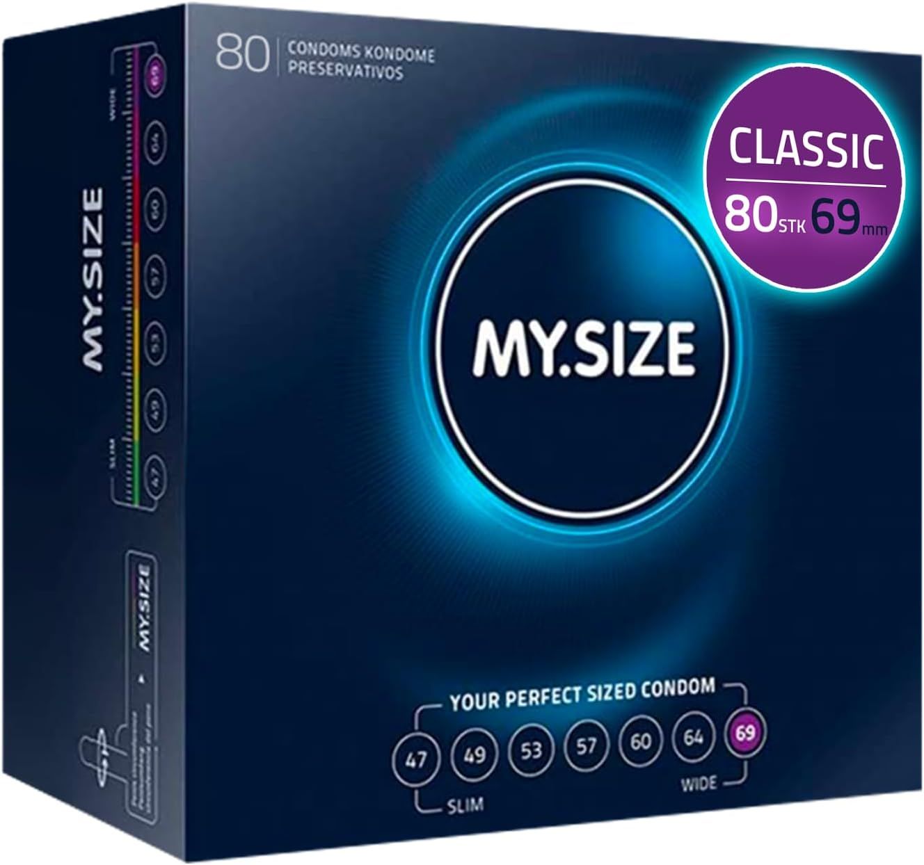 IL MEGA AFFARE: preservativo MY.SIZE, larghezza 69 mm, 80 pezzi. Disponibile in altre larghezze nominali. Etichettato CE. Conforme alla direttiva UE sui dispositivi medici 93/42 CEE. Con applicazione di misurazione online gratuita.