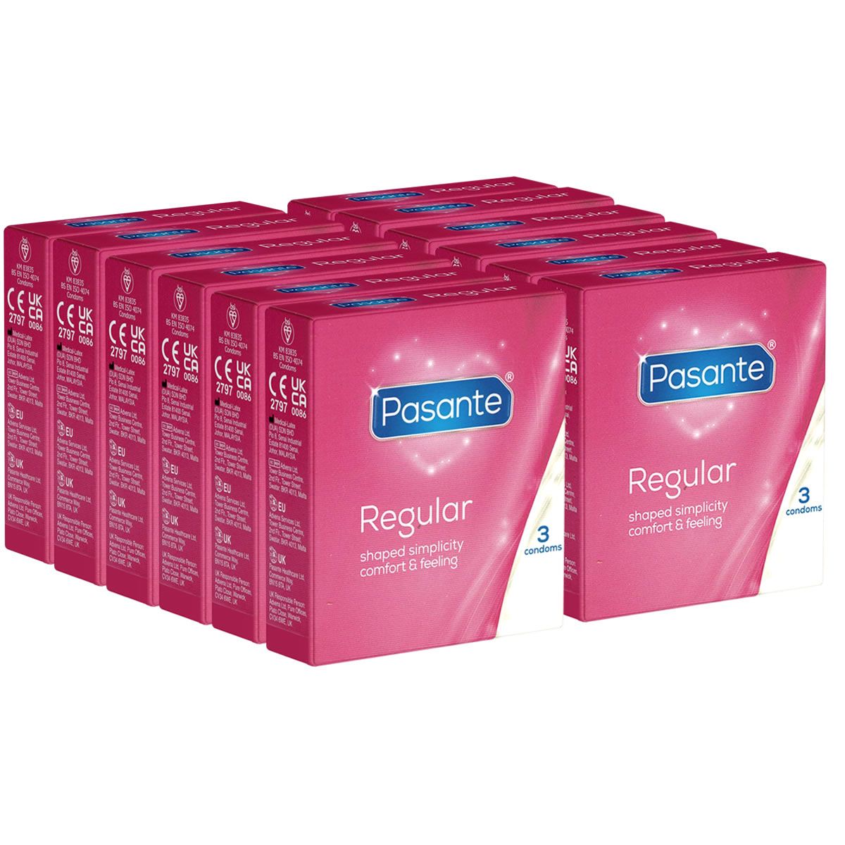 I preservativi Pasante «Regular» nella confezione risparmio 12x3 hanno una forma anatomica e una testa allungata con un diametro di 66 mm, che consente una maggiore libertà di movimento. Con una larghezza nominale di 54 mm e una lunghezza di 190 mm, garantiscono una vestibilità confortevole.