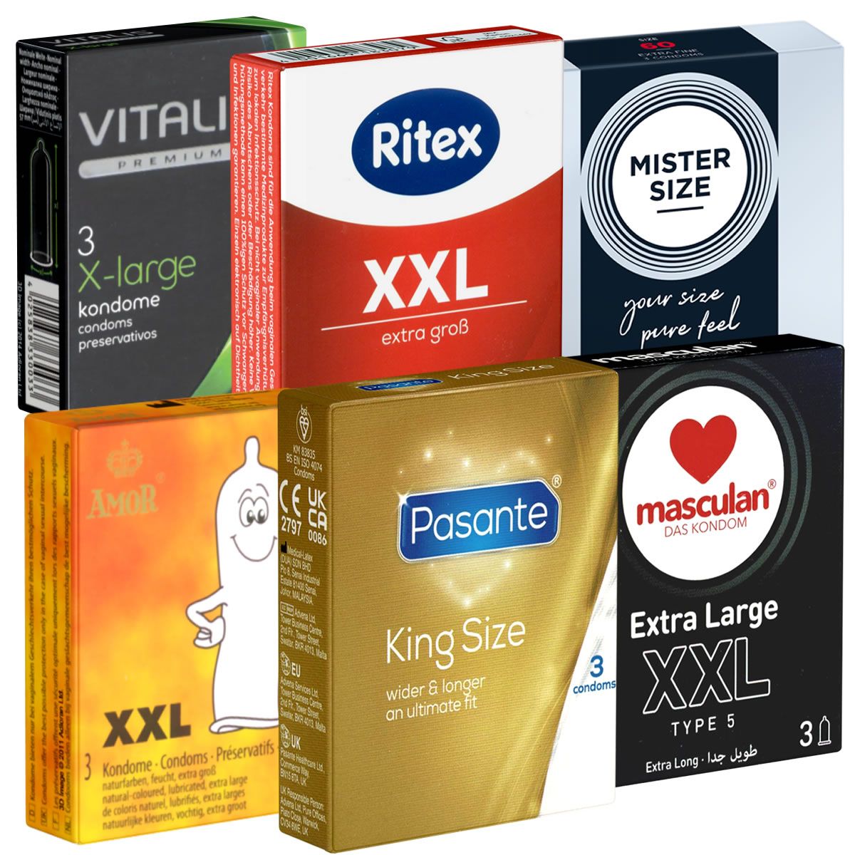 Il set contiene sei diverse marche, ciascuna in una confezione da tre: Vitalis X-Large (57 mm) con una lunghezza maggiore, Ritex XXL (55 mm) prodotto in Germania con un'ottima tollerabilità cutanea, Pasante King Size (60 mm) e Mister Size 60 (60 mm) con la larghezza maggiore della gamma, oltre a Masculan Type 5 XXL (54 mm) e Amor XXL (54 mm) per una classica vestibilità XL.