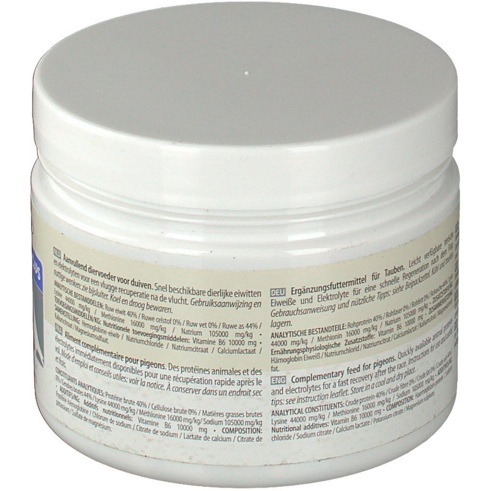 Miscela unica di proteine animali facilmente digeribili, minerali, elettroliti e vitamina B6. Da somministrare immediatamente dopo il volo per un rapido recupero.