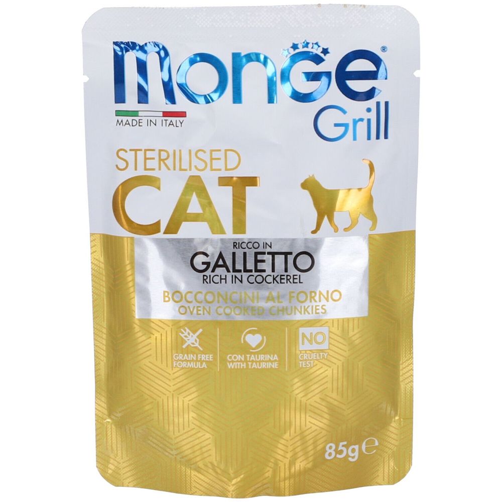 Contenuto del Set- 7x Monge Grill Sterilised Cat Bocconcini Al Forno Ricco In Galletto 85 g