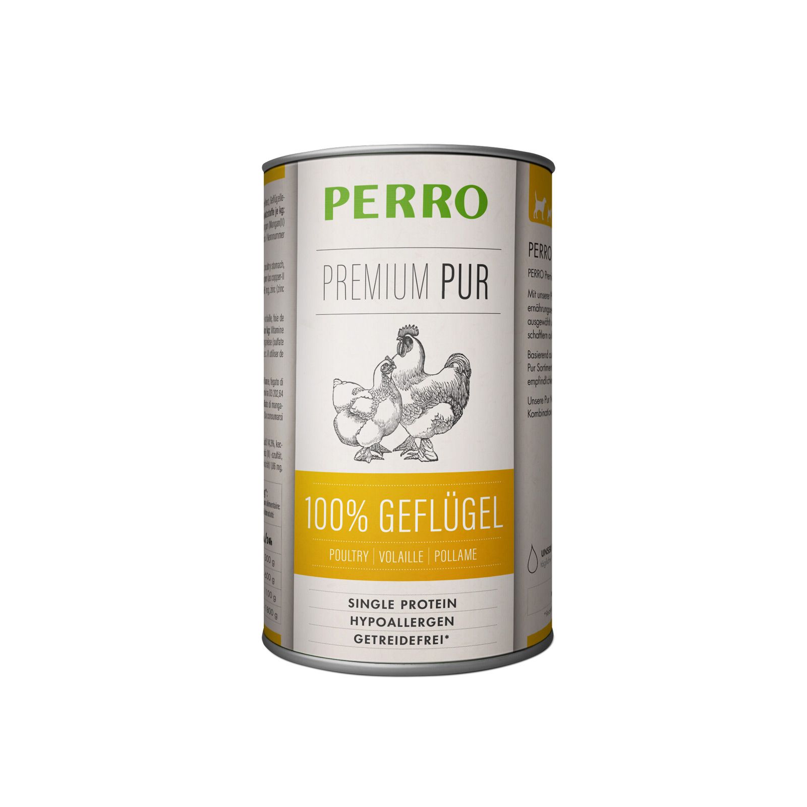 Le scatolette di carne al 100% fungono da mattone per un design di mangime individuale in combinazione con l'assortimento di scaglie PERRO. Basato su una sola fonte proteica selettiva, PERRO Premium Pur è ideale come parte di diete di esclusione, con le quali è possibile filtrare l'ipersensibilità a determinati componenti alimentari.
