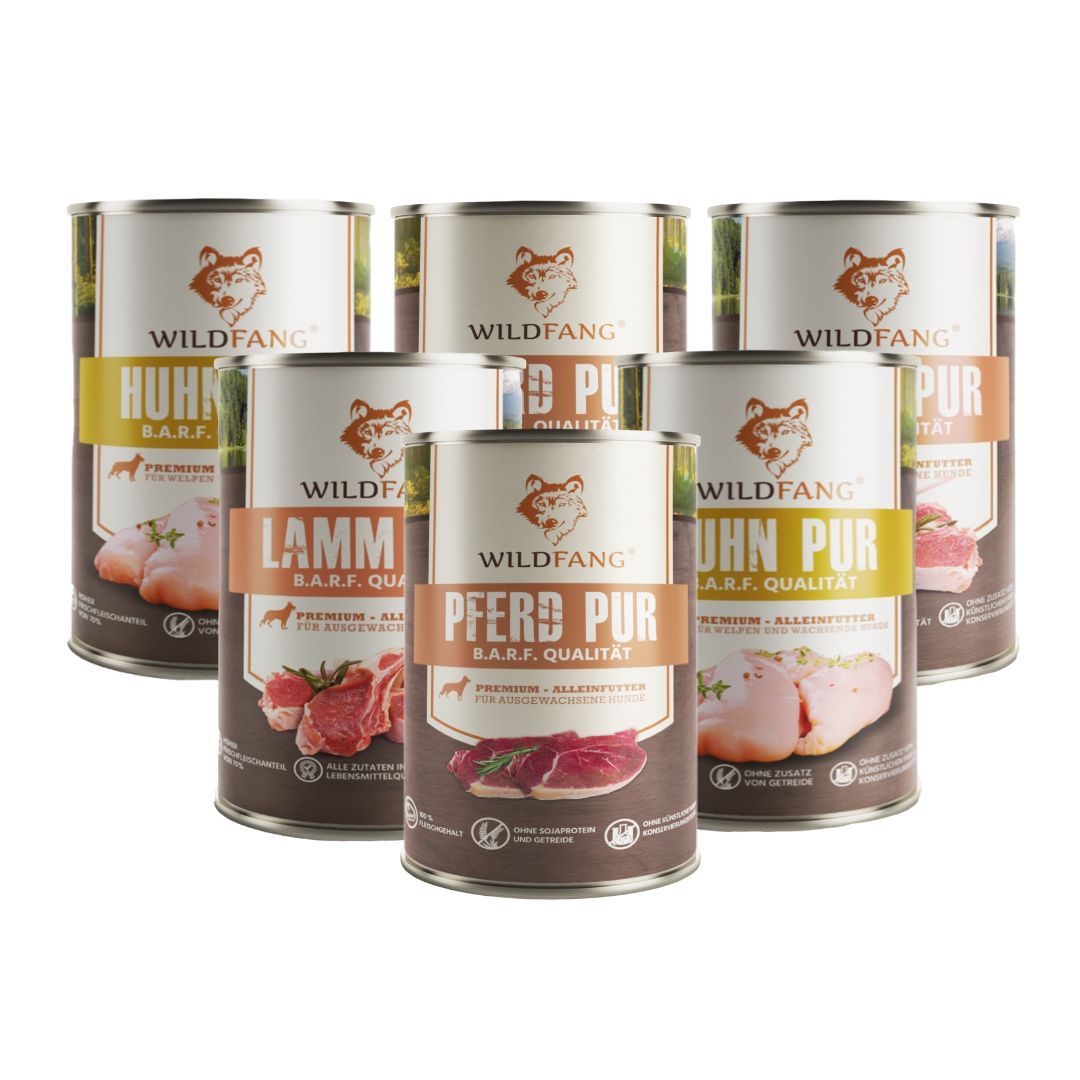 Il nostro Wildfang® Premium Pure Wet Food è ideale come alimento completo per il tuo cane adulto e si distingue per la sua esclusiva qualità B.A.R.F. L'ingrediente principale è una deliziosa fonte di proteine, fornisce al tuo cane tutti i nutrienti essenziali, è ricco di aminoacidi e ha un basso contenuto di grassi. Essendo privo di cereali, il nostro cibo umido è particolarmente digeribile e può quindi essere somministrato anche a cani con intolleranza ai cereali. Alimento completo per cani adulti. Contenuto per 2 varietà: 3 lattine da 400 g per varietà. Contenuto per 3 varietà: 2 lattine da 400 g per varietà. Caratteristiche principali in sintesi: Una sensazione di gusto per il tuo amico a quattro zampe: questo alimento completo di alta qualità per cani fornisce al tuo cane una dieta sana ed equilibrata, oltre che deliziosa. Pure prelibatezze: il cibo umido B.A.R.F. Il nostro prodotto di qualità ha un alto contenuto di carne del 70% ed è composto esclusivamente da carne muscolare e frattaglie di alta qualità, come cuore, fegato, polmoni e trippa. Il benessere del tuo cane è la nostra massima priorità, per questo evitiamo completamente coloranti e conservanti artificiali, nonché cereali e zuccheri aggiunti.