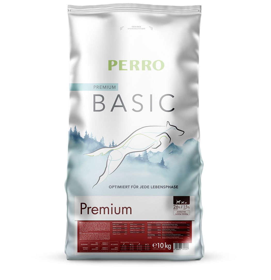 Il tuo cane è attivo, ama muoversi e ha elevate esigenze nutrizionali? Allora PERRO Basic Premium è la scelta ideale. Questo alimento completo ricco di sostanze nutritive e senza glutine per cani adulti fino ai 7 anni è stato sviluppato appositamente per i cani amanti dell’attività fisica e si basa su una ricetta moderna con carne fresca.