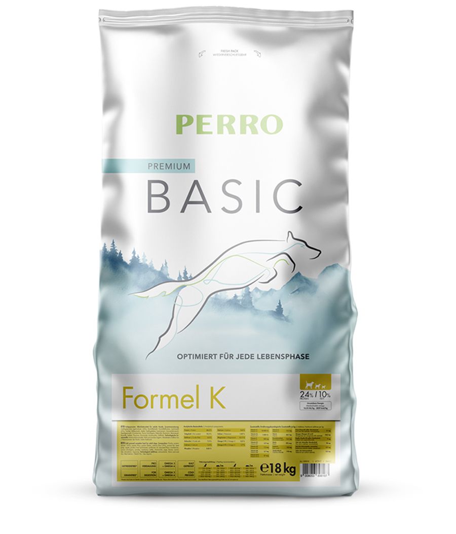 Per i cani con un apparato digerente sensibile o con intolleranze note, è fondamentale un’alimentazione particolarmente delicata. PERRO Basic Formula K è un alimento completo pressato a freddo sviluppato appositamente per queste esigenze – completo, ben tollerato e naturalmente gustoso.