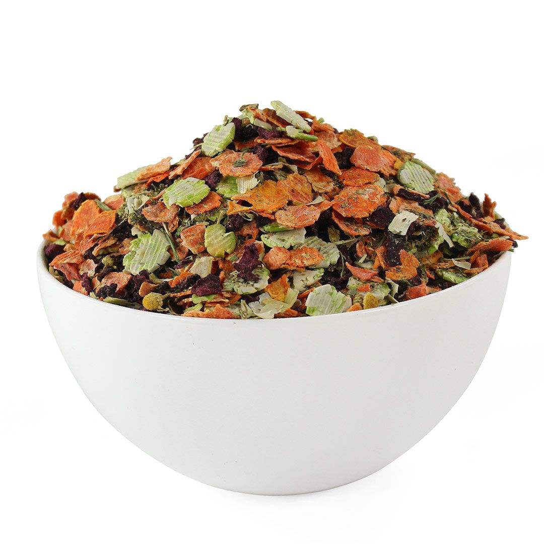 fiocchi di carota, fiocchi di piselli, barbabietola rossa, gambo di prezzemolo, porro, mix di erbe (foglie di ortica, carote, gambo di sedano, fiori di camomilla, finocchio, cumino, achillea, foglie di mora, semi di lino, vischio, radice di calamo, radice di rabarbaro, radice di consolida maggiore, genziana)