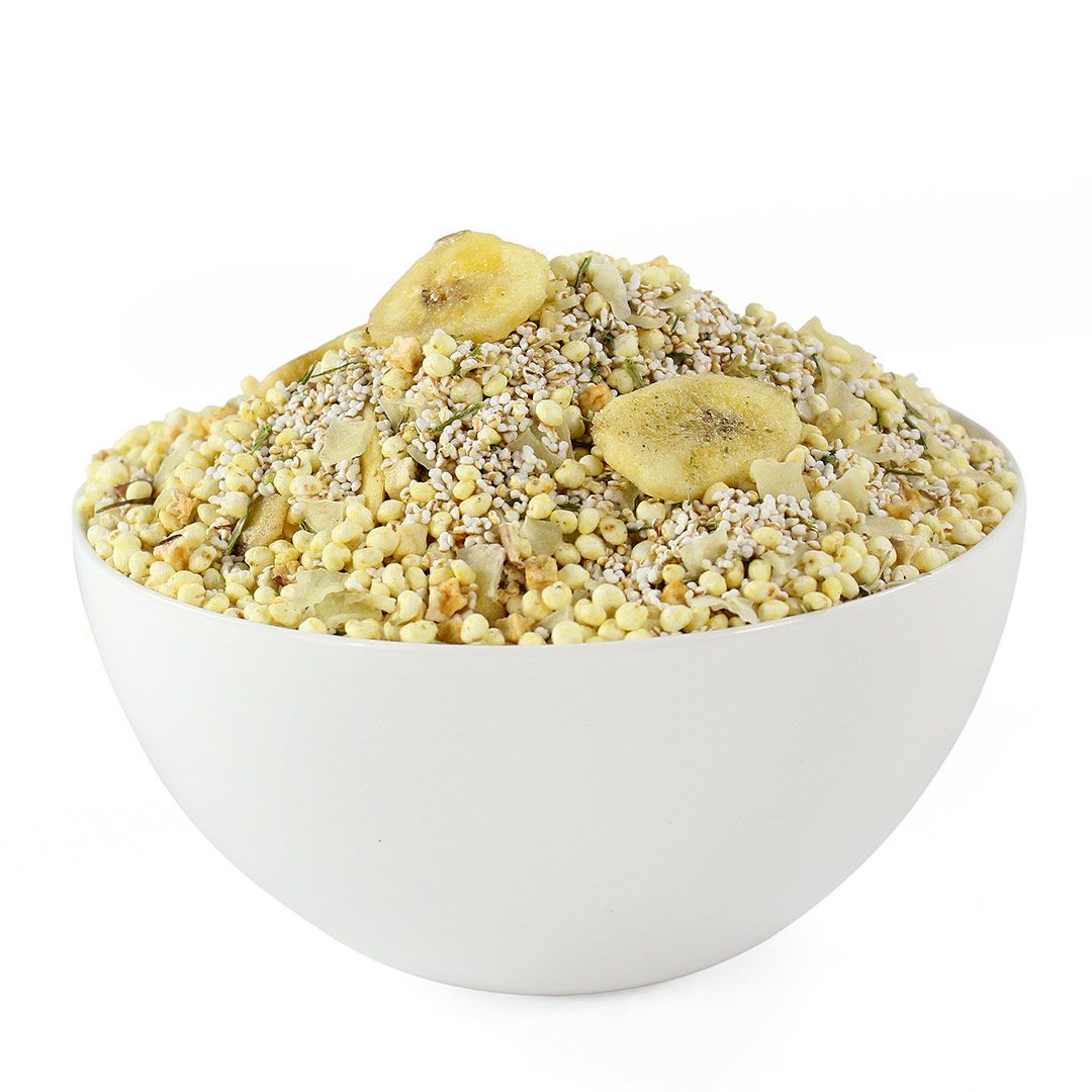 fiocchi di patata, amaranto biologico soffiato 20%, miglio soffiato, pezzi di banana, pezzi di mela, prezzemolo